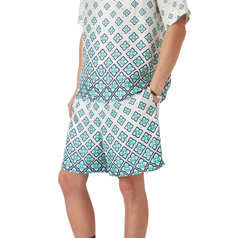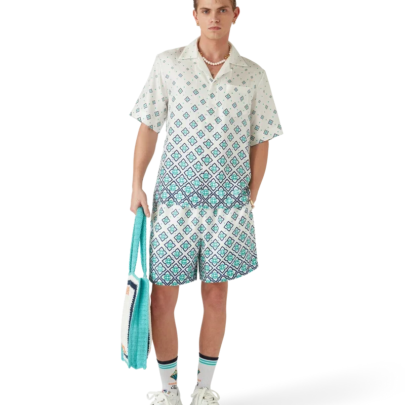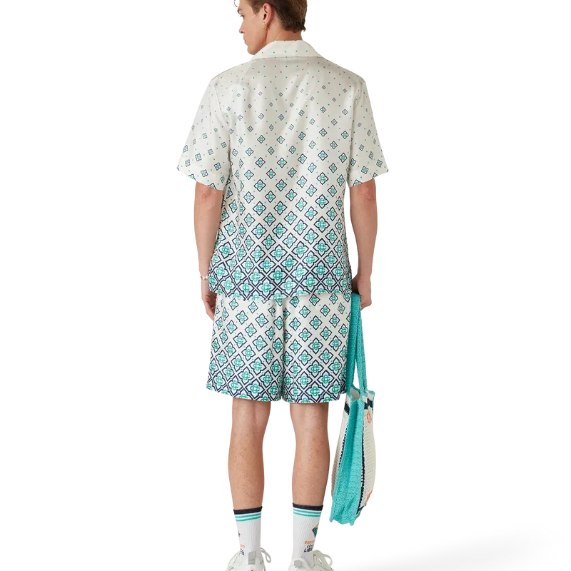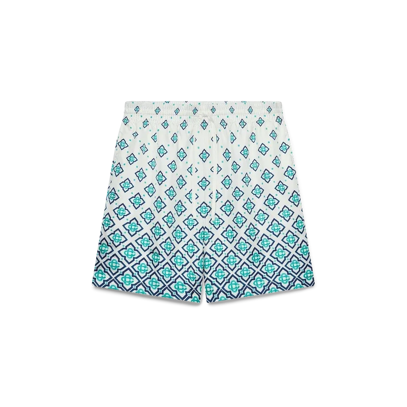 Pantaloni scurți din mătase cu monogramă degradată au un design imprimat, fiind confecționați din țesătură de mătase twill. Prezintă o bandă elastică în talie cu închidere cu șnur, buzunare laterale în cusătură, căptușeală și un buzunar aplicat în spate.