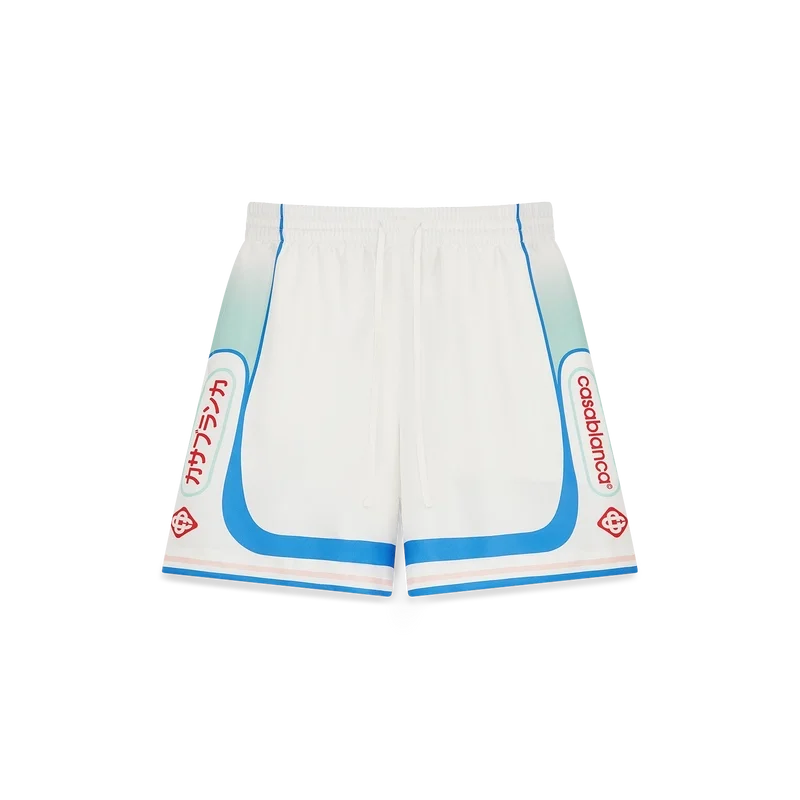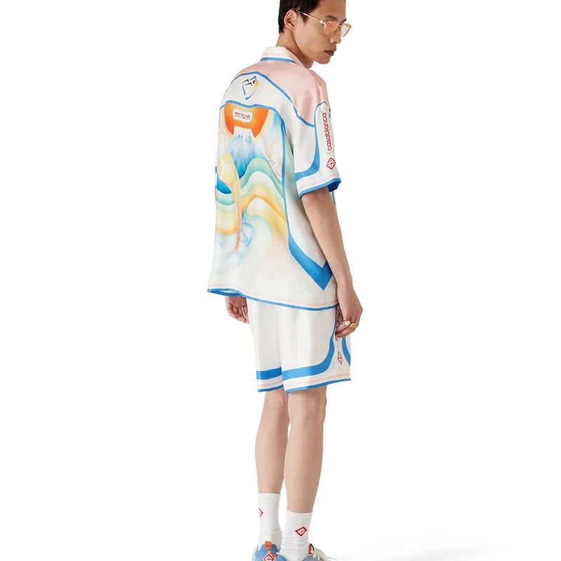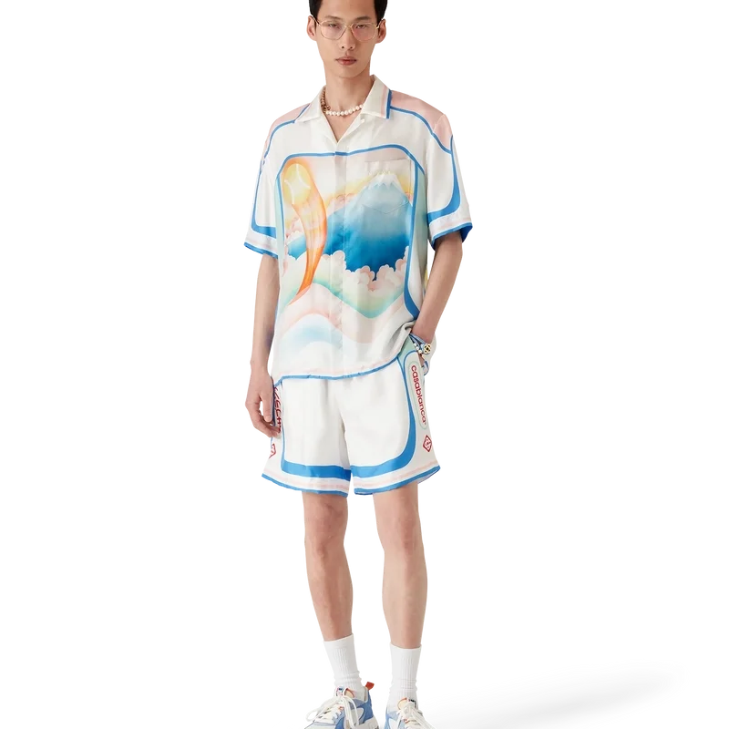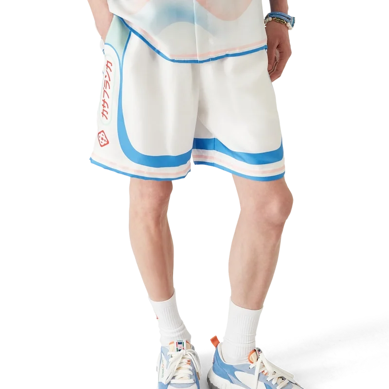 Pantaloni scurți din mătase Fuji Dream au un design imprimat cu o grafică care prezintă o viziune de vis a unei excursii la Muntele Fuji – confecționați din țesătură de mătase twill. Prezintă o bandă elastică la talie, buzunare laterale în cusătură, un buzunar spate, detaliu cu dungi la tiv și grafică pe părțile laterale.