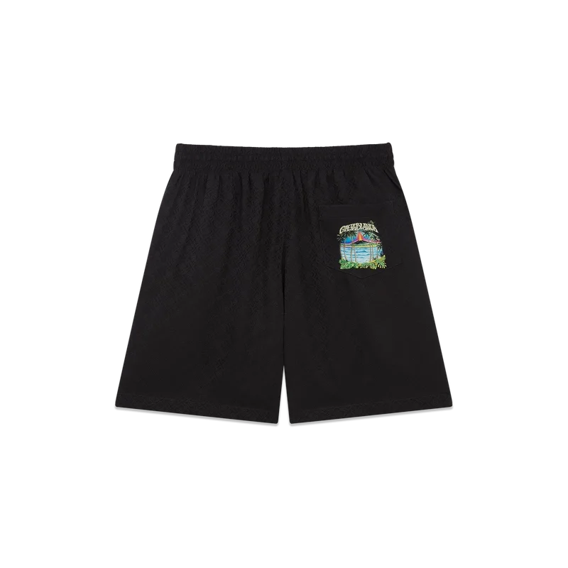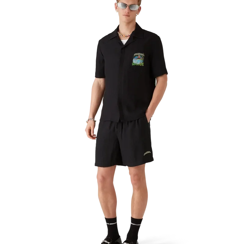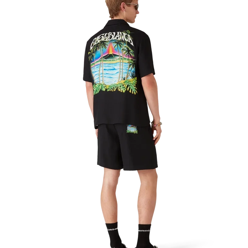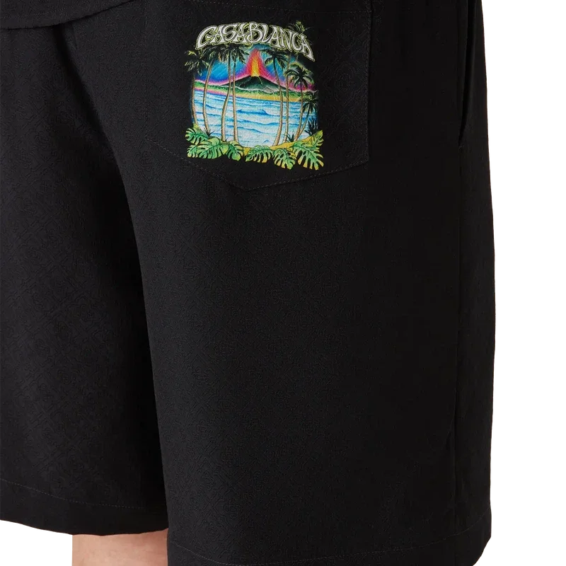 Pantaloni scurți din mătase Volcano au un design rafinat, prezentând ilustrația sezonului: un vulcan care se profilează dramatic în spatele unor palmieri pe jumătate conturați, în plină erupție, energia sa aprinsă contrastând puternic cu scena senină și liniștită din prim-plan. Completate cu o bandă elastică la talie, închidere cu șnur, buzunare laterale în cusătură, un buzunar aplicat în spate și o siluetă relaxată care surprinde abordarea de lux a mărcii în materie de îmbrăcăminte casual.