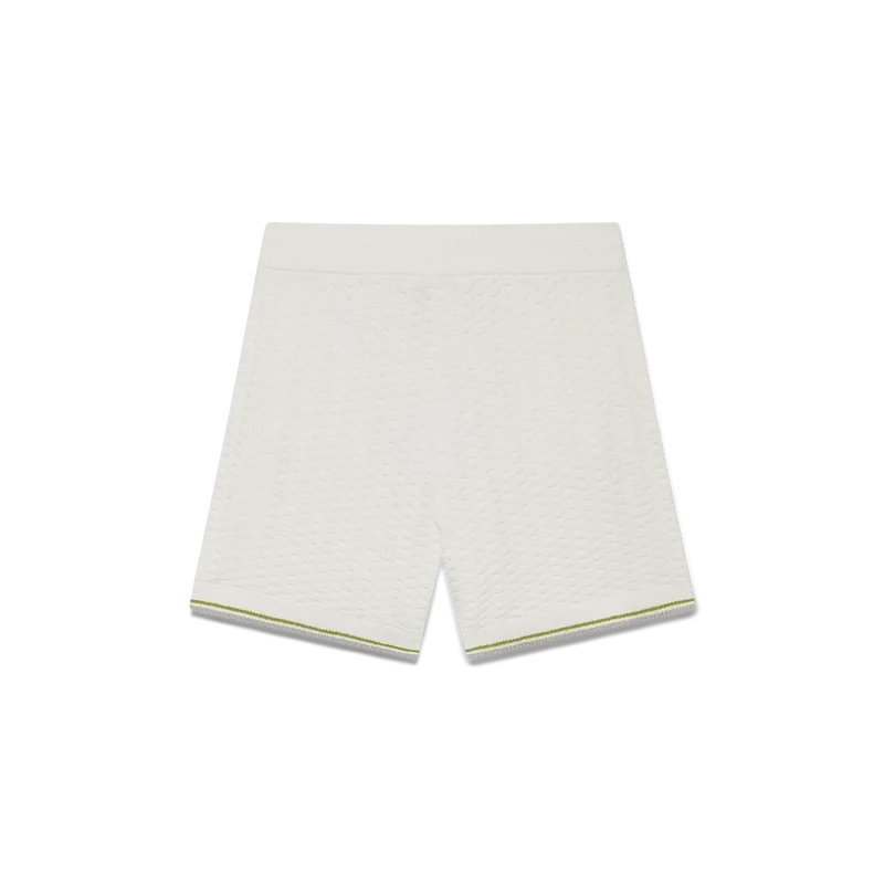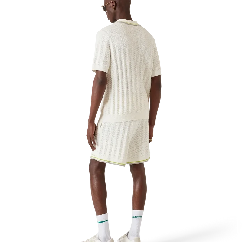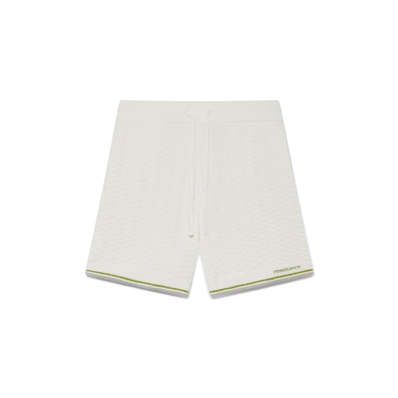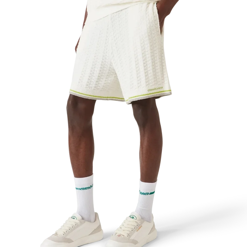 Pantaloni scurți de tenis din țesătură bouclé au un design texturat, cu logo-ul Casablanca al casei de modă. Sunt completați cu logo-ul Casablanca, semnătura casei de modă, o bandă elastică în talie, închidere cu șnur și tiv cu nervuri și detalii cu margini în dungi.