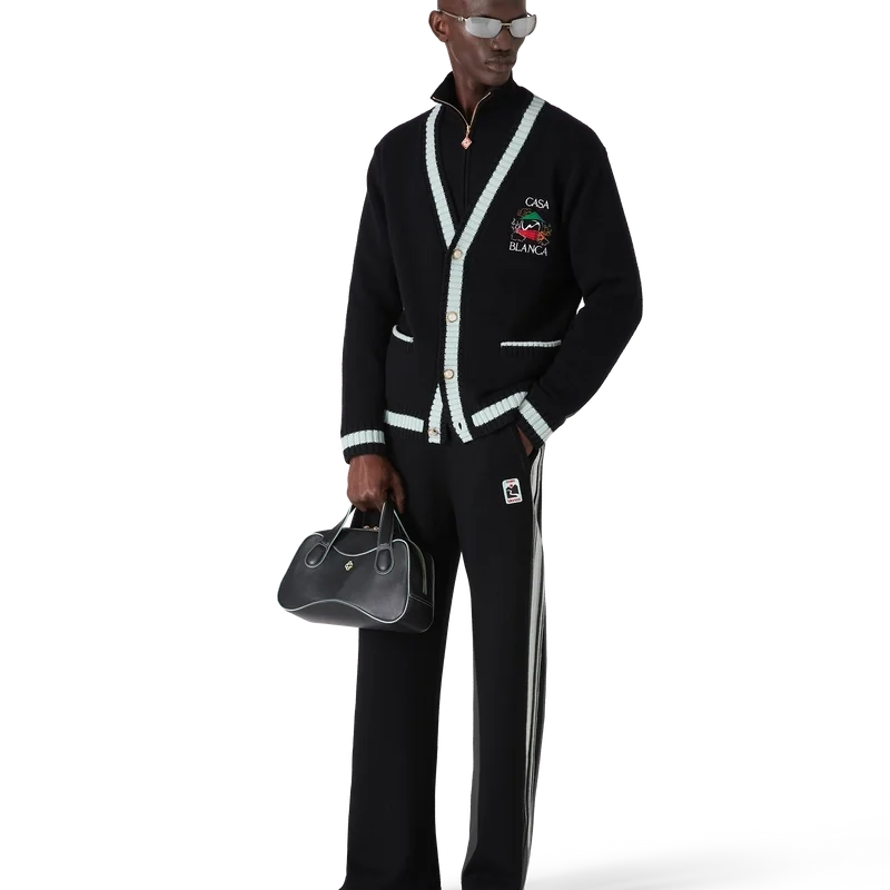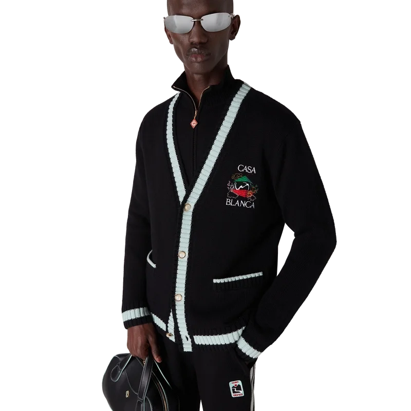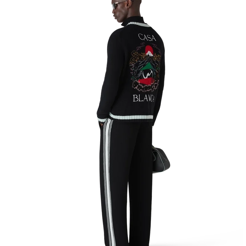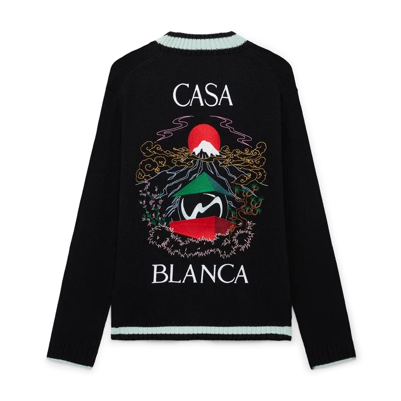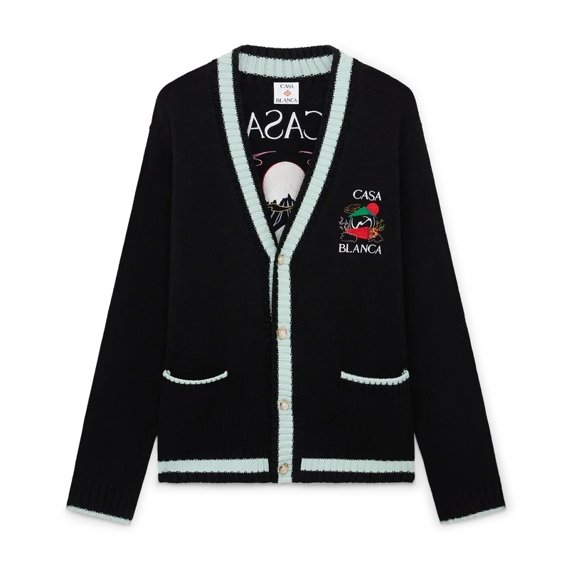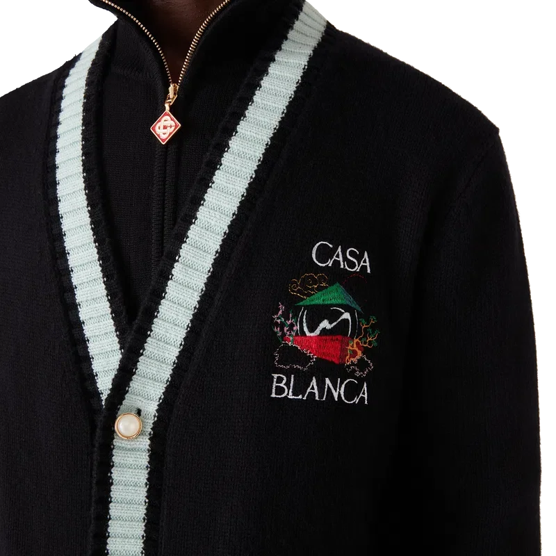 Cardiganul Casa Mountain Temple este un model cu mâneci lungi, cu broderii cu motive de sezon, confecționat din țesătură de lână merino. Are guler rotund clasic, manșete și tiv cu nervuri.