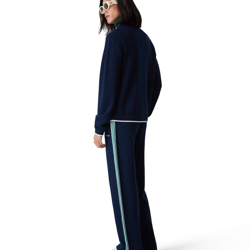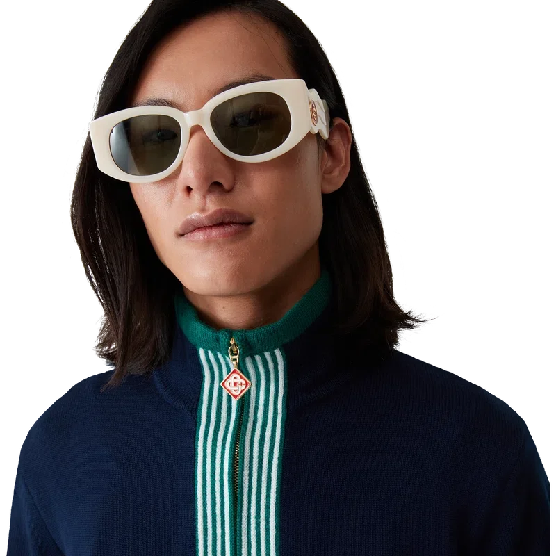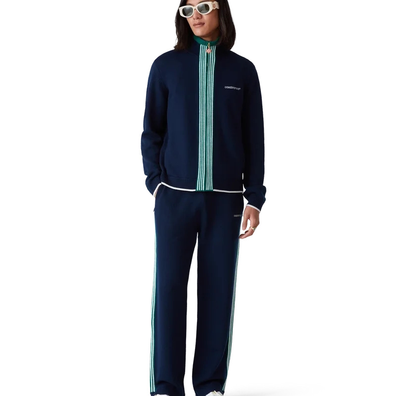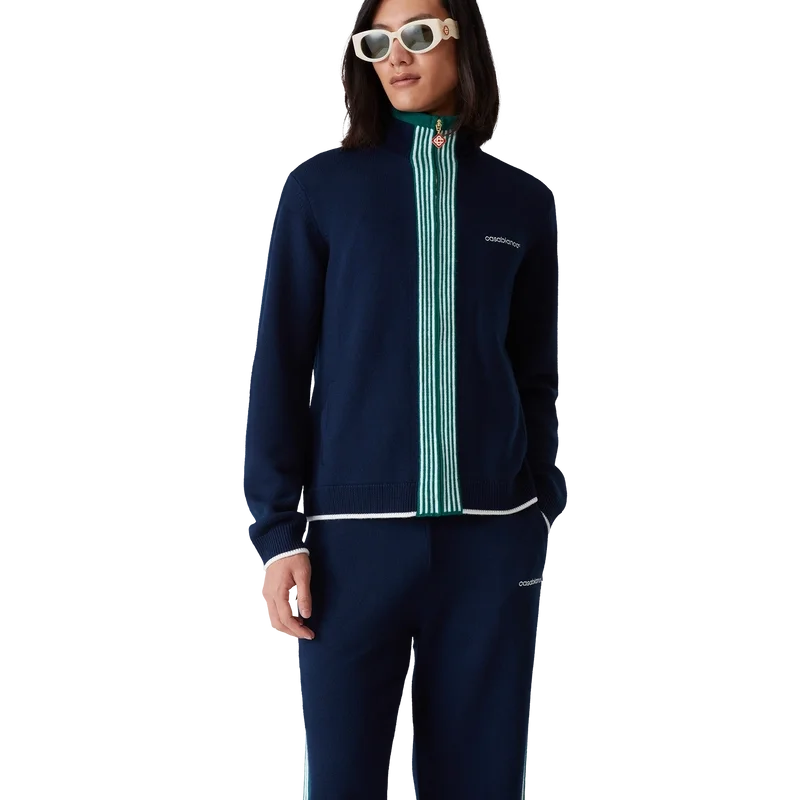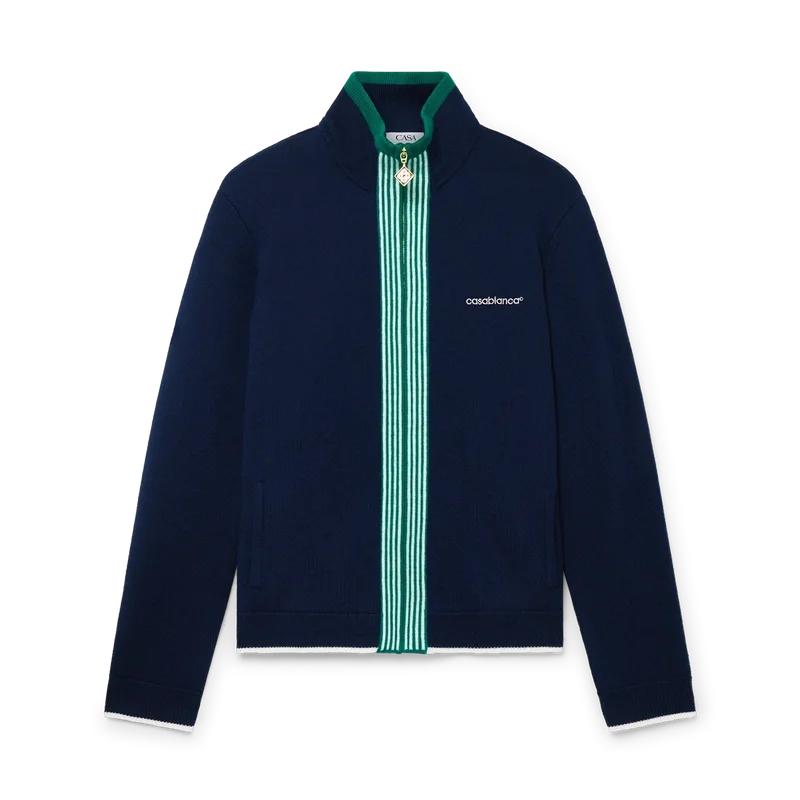 Jacheta de tenis din tricot este un model clasic, confecționată din țesătură din lână merino. Prezintă detalii cu margini cu nervuri contrastante la manșete, tiv, placket și guler în formă de pâlnie, închidere cu fermoar în față și logo Casablanca.