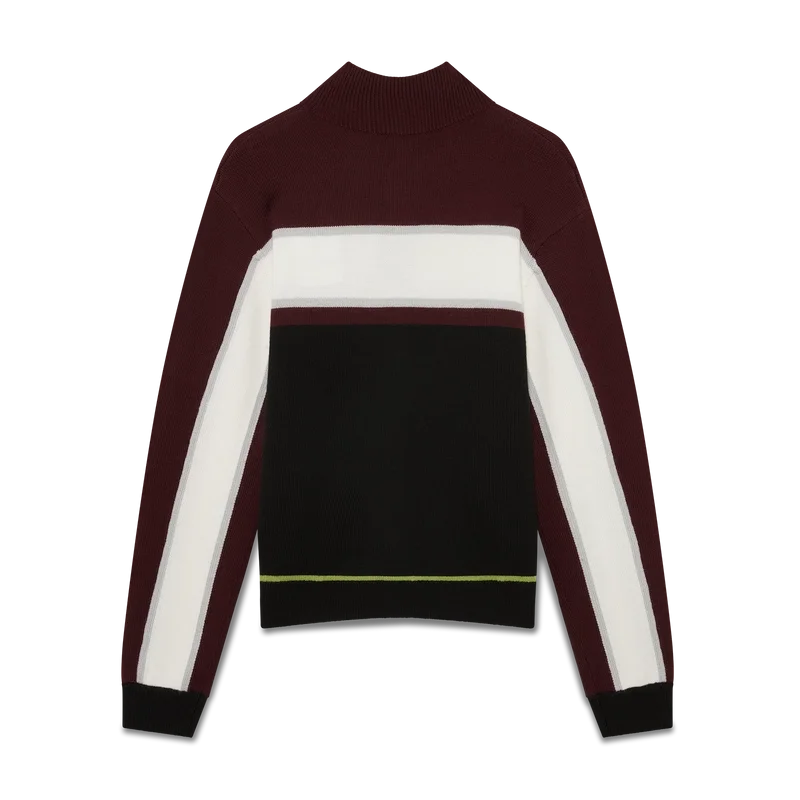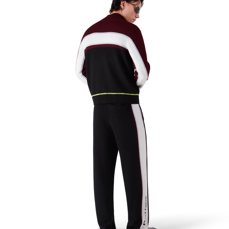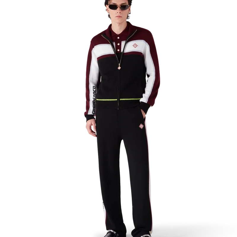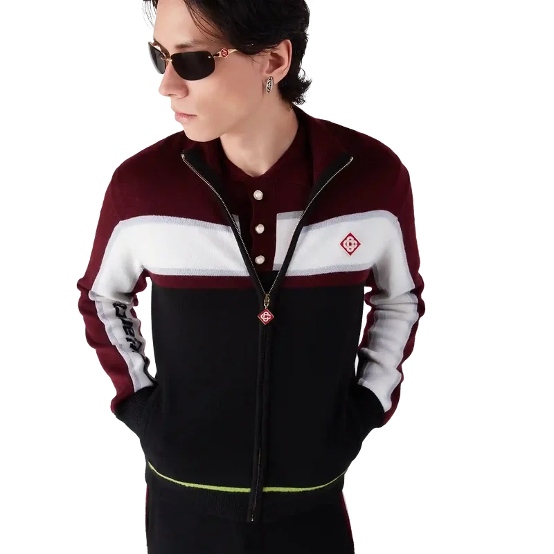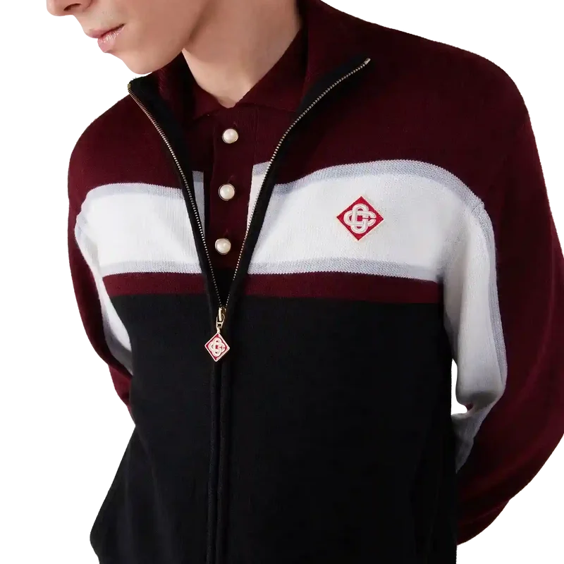 Jacheta Stripe Merino este un model rafinat Apras-Sport, cu o construcție din tricot texturat. Finisată cu o închidere cu fermoar complet, cu logo-ul diamant caracteristic al casei, detalii cu dungi pe piept și mâneci, branding Casablanca și o croială lejeră care îmbină confortul sportiv cu sensibilitatea haute couture.