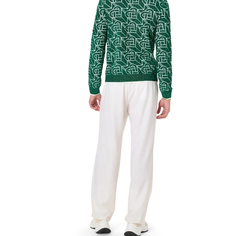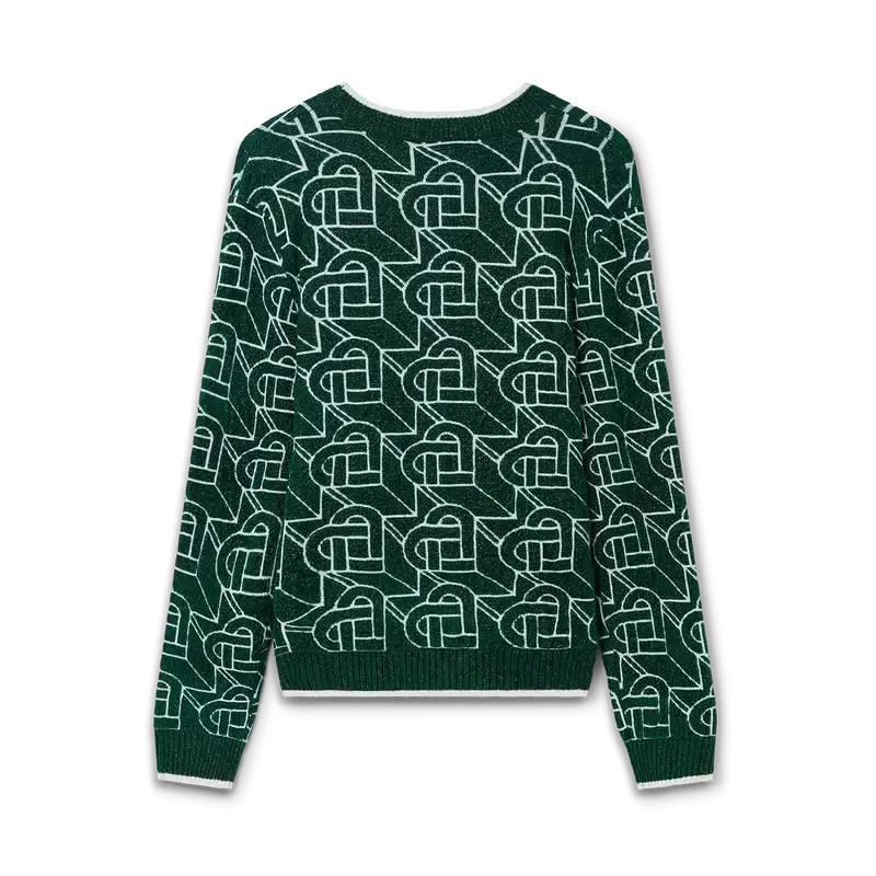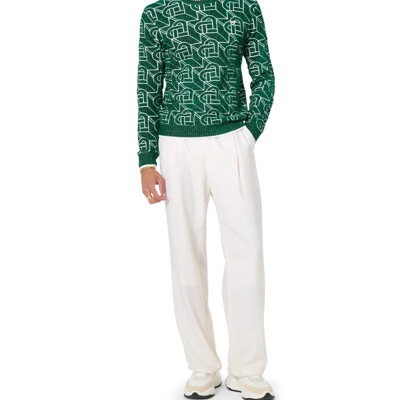 Puloverul cu monogramă în formă de inimă este un model tricotat cu mâneci lungi, prezentând designul caracteristic al casei, cu monogramă în formă de inimă pe toată suprafața, cu fire aurii, completat cu nituri în formă de inimă emailate și placate cu aur ale casei și o etichetă cu marca Casablanca.