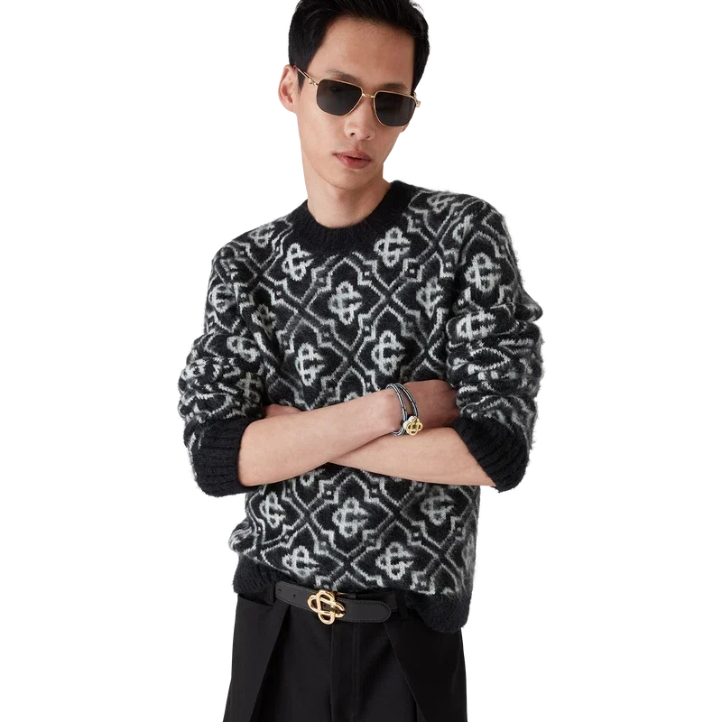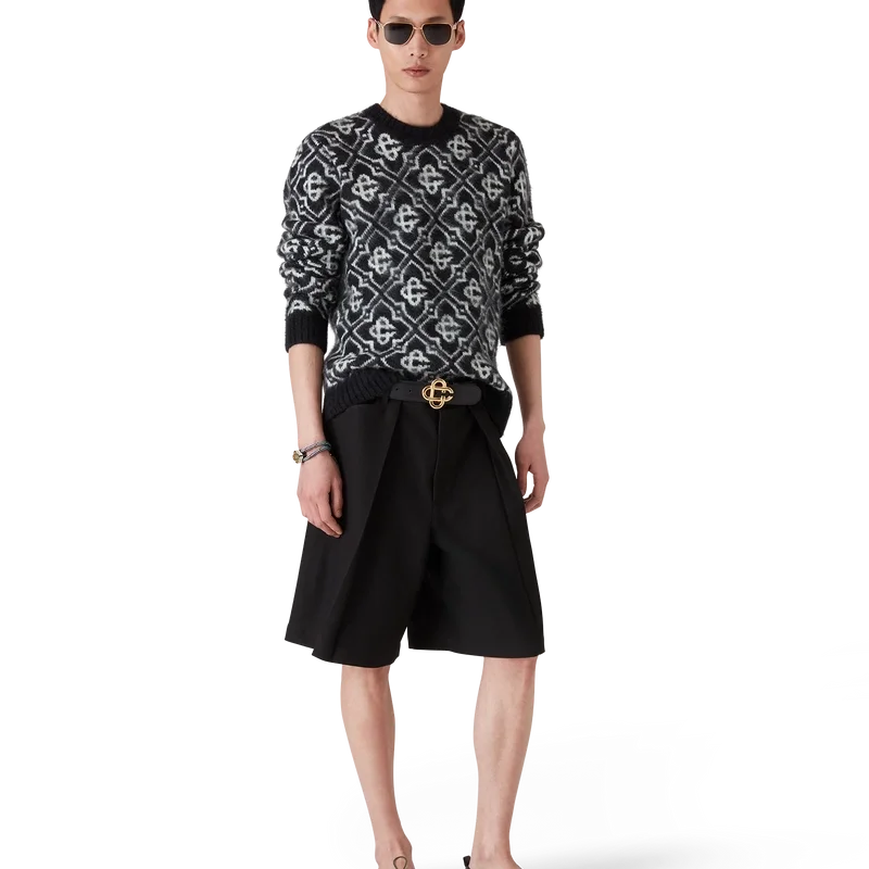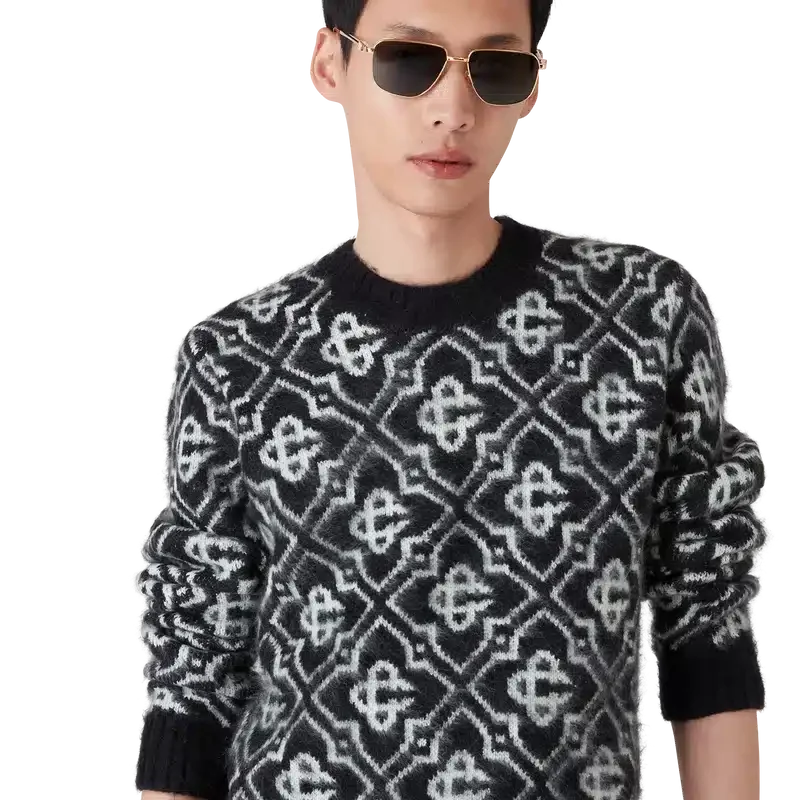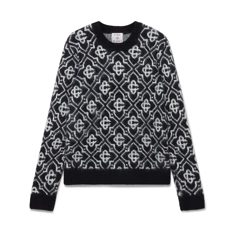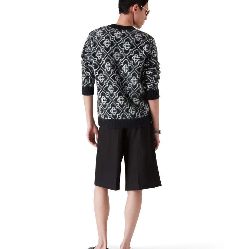 Puloverul din mohair cu monogramă este un model cu mâneci lungi și monogramă, confecționat din țesătură de mohair. Este completat de manșete și tiv cu nervuri în culori contrastante și un guler clasic rotund.