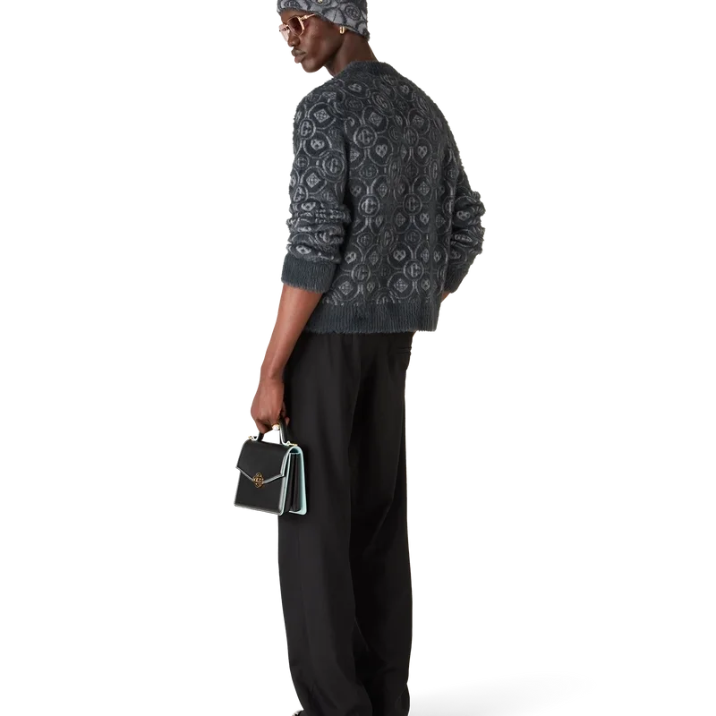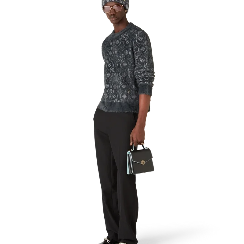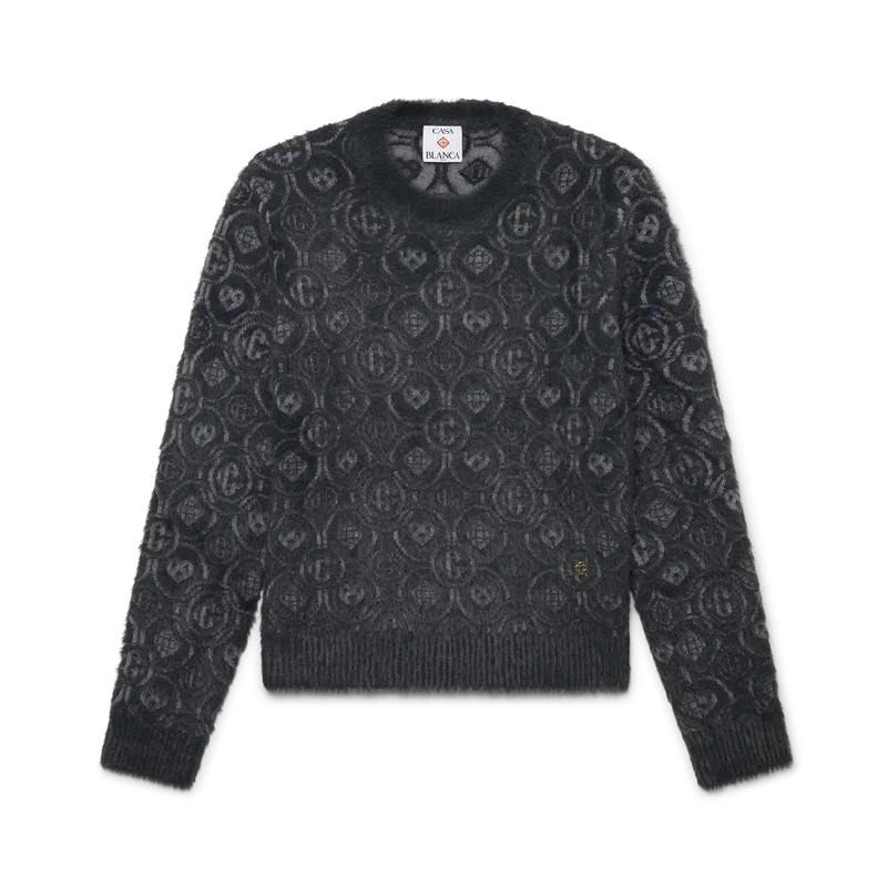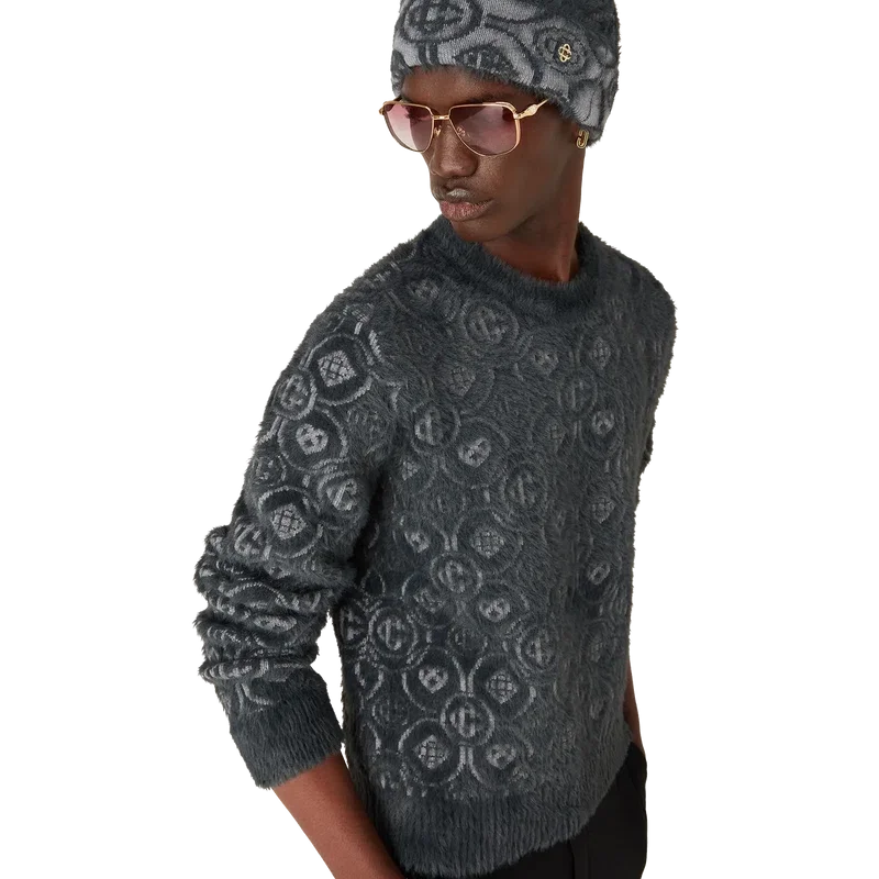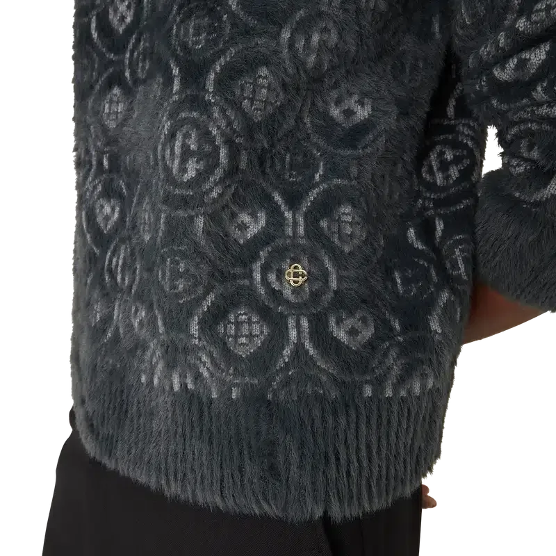 Puloverul pufos cu monogramă este un model cu mâneci lungi, confecționat dintr-un material tricotat pufos, din amestec de lână, cu logo-ul Honeydew al casei repetat. Acest model diferă de celelalte monograme ale noastre, deoarece combină forme unice pentru a forma un model coerent. Completat cu un nit interconectat CC placat cu aur, un guler clasic cu nervuri, manșete și detalii la tiv.