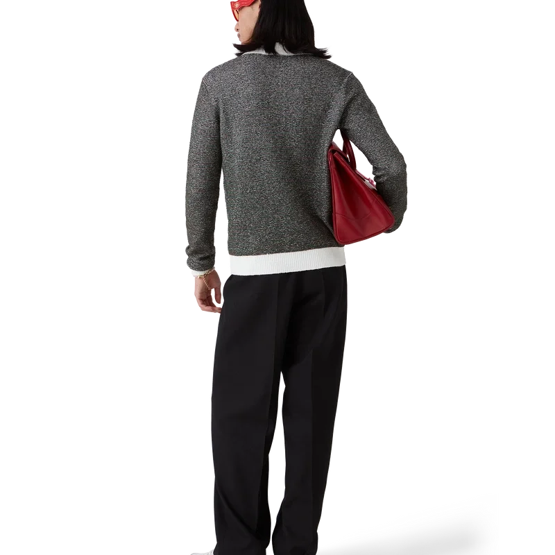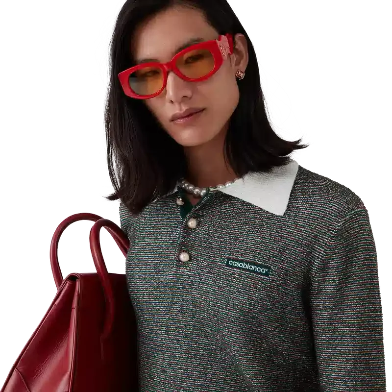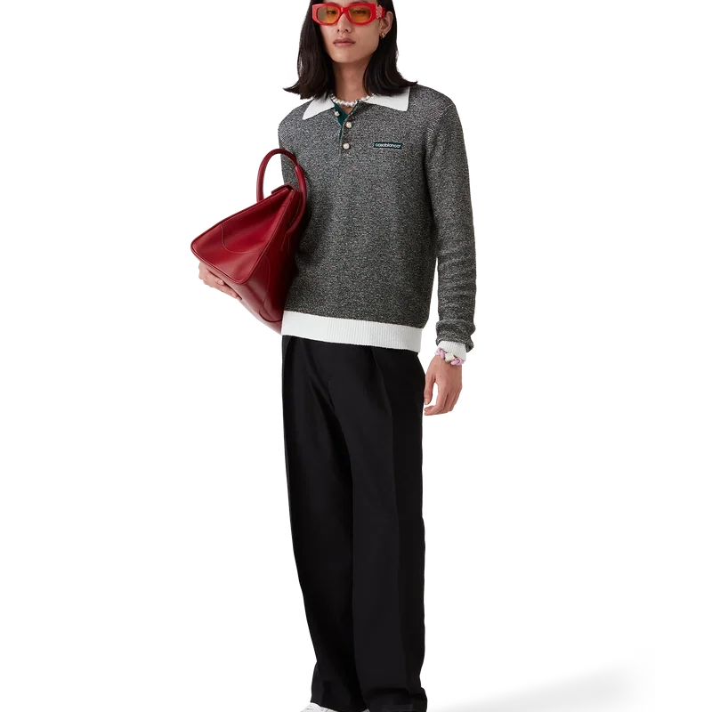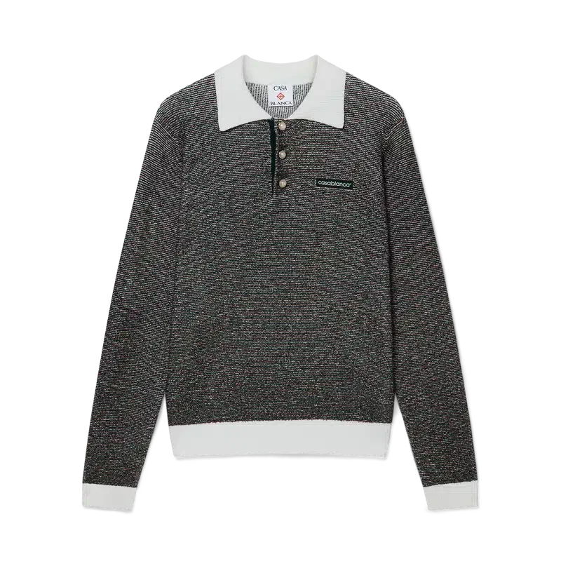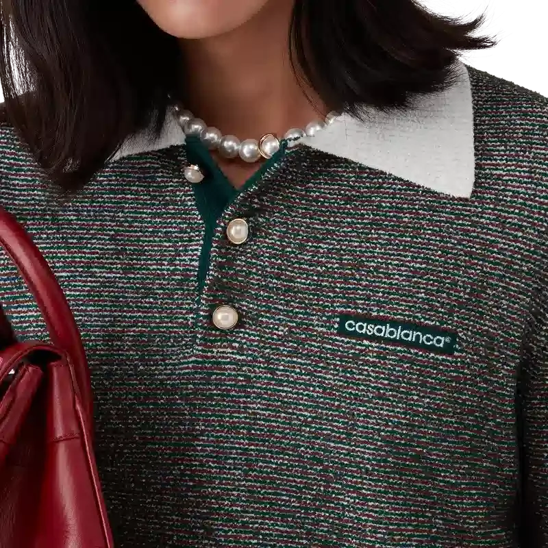 Tricoul polo cu dungi bouclé este un model cu mâneci lungi, confecționat din țesătură cu dungi bouclé, cu logo-ul Casablanca al casei. Este completat cu o placket cu trei nasturi, nasturi cu margine aurie și margini contrastante la placket, tiv, manșete și guler.