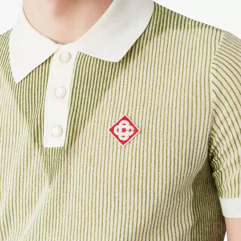 Tricou polo cu mâneci scurte și dungi verticale are un design rafinat din tricot, cu o siluetă lejeră. Este completat de guler și placket în contrast, închidere cu nasturi, nasturi cu margine aurie și perle, detalii cu borduri la mâneci și tiv, precum și logo-ul casei de modă pe mâneci.