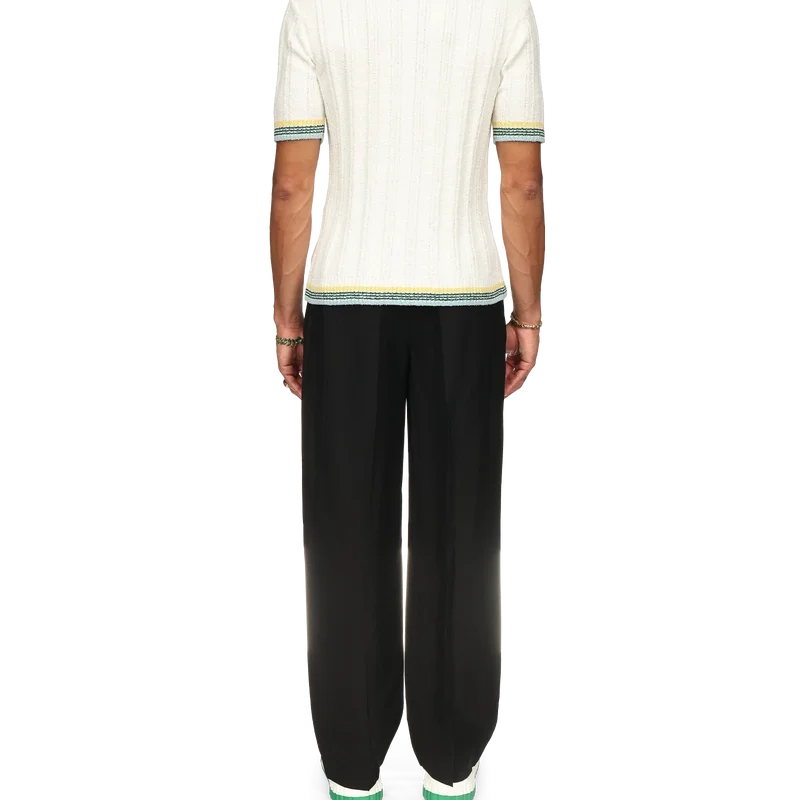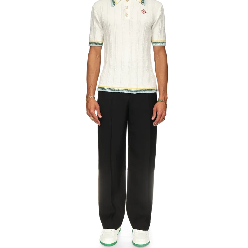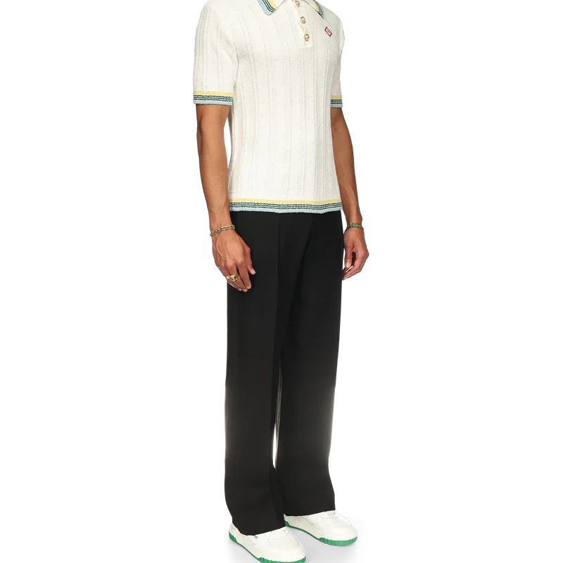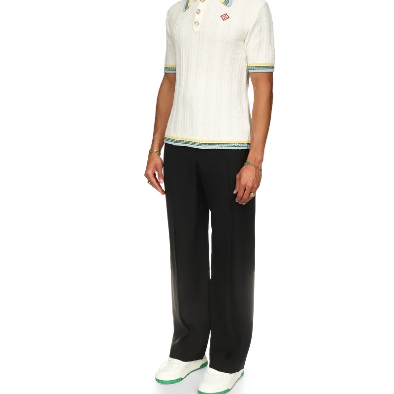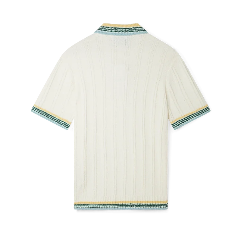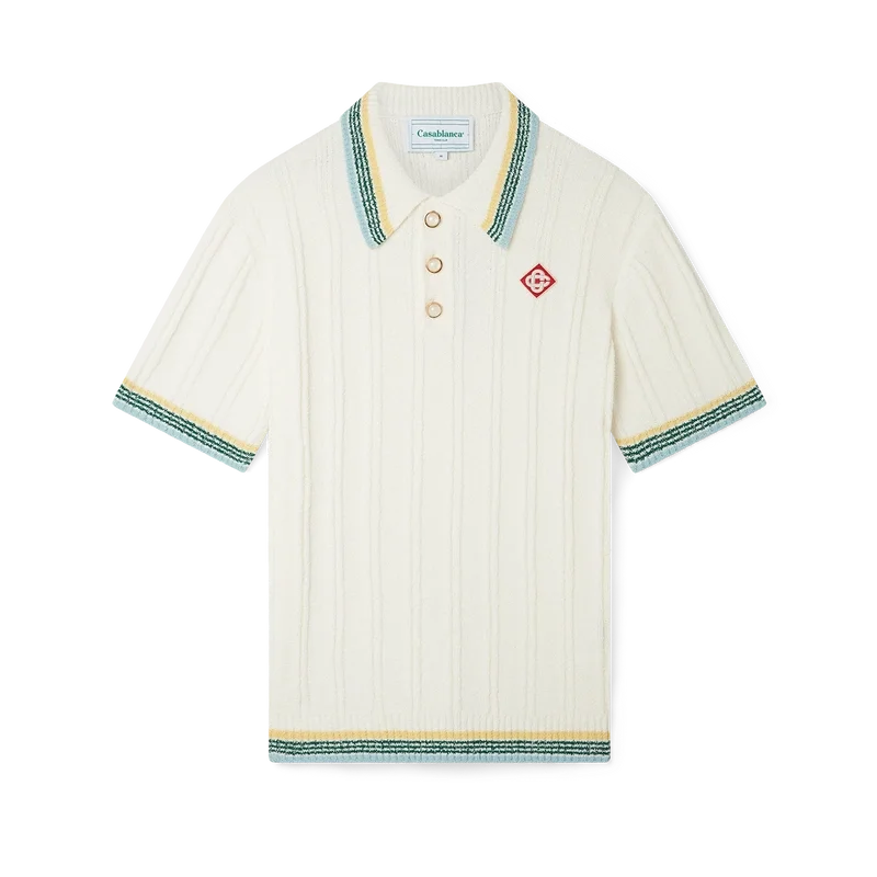 Tricoul polo din bucle cu nervuri prezintă un logo roșu în formă de romb și o textură nervurată. Confecționat dintr-un material din amestec de bumbac și finisat cu nasturi perlați cu margine aurie, o etichetă cu marca Casablanca și detalii cu dungi pe guler, manșete și tiv.