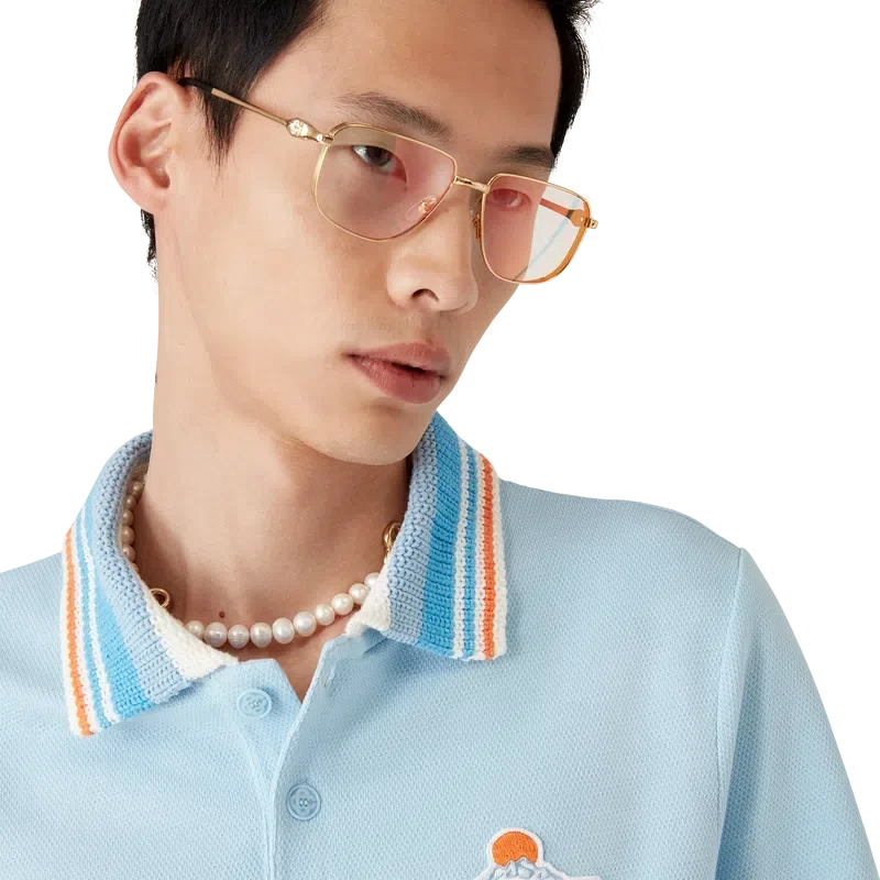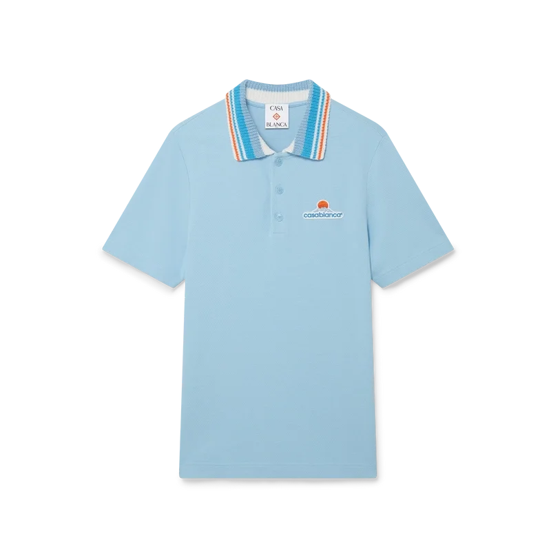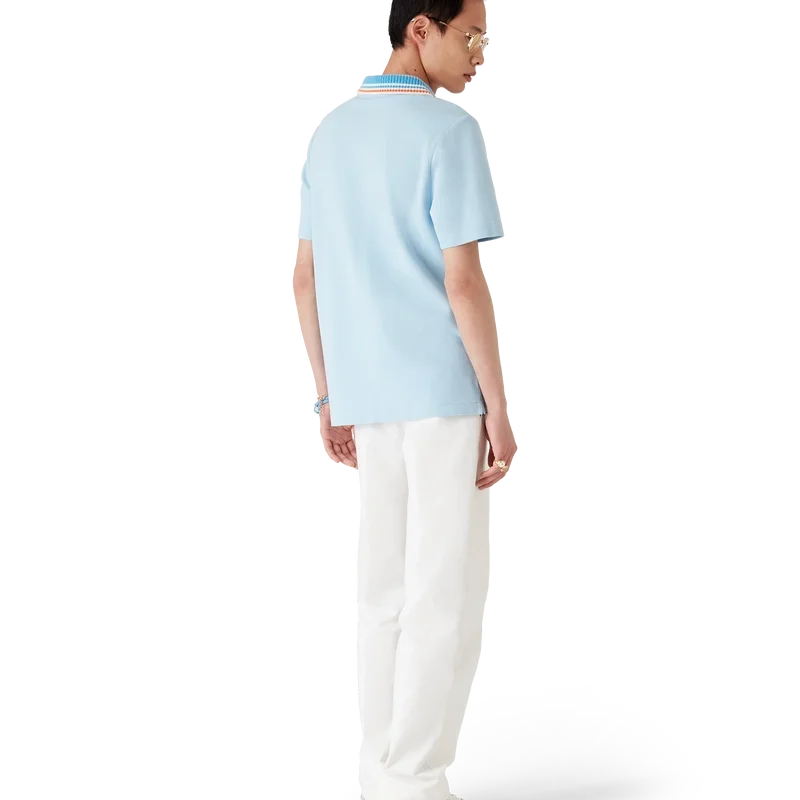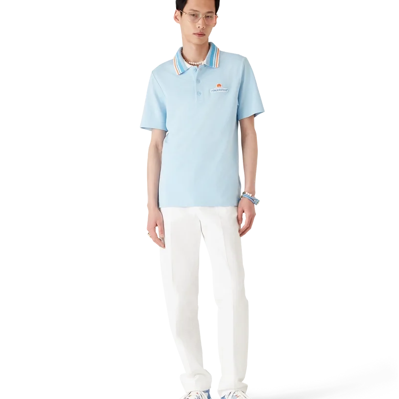 Tricou polo cu mâneci scurte din tricot piqué are un design clasic, cu logo-ul Casa Montagne – un logo care la prima vedere arată ca un munte, dar care, dacă te uiți mai atent, se citește Casa – confecționat din țesătură piqué din bumbac organic. Completat cu închidere cu nasturi, nasturi din corozo cu logo Cc intercalat și guler din tricot cu dungi portocalii, albastre și albe.
