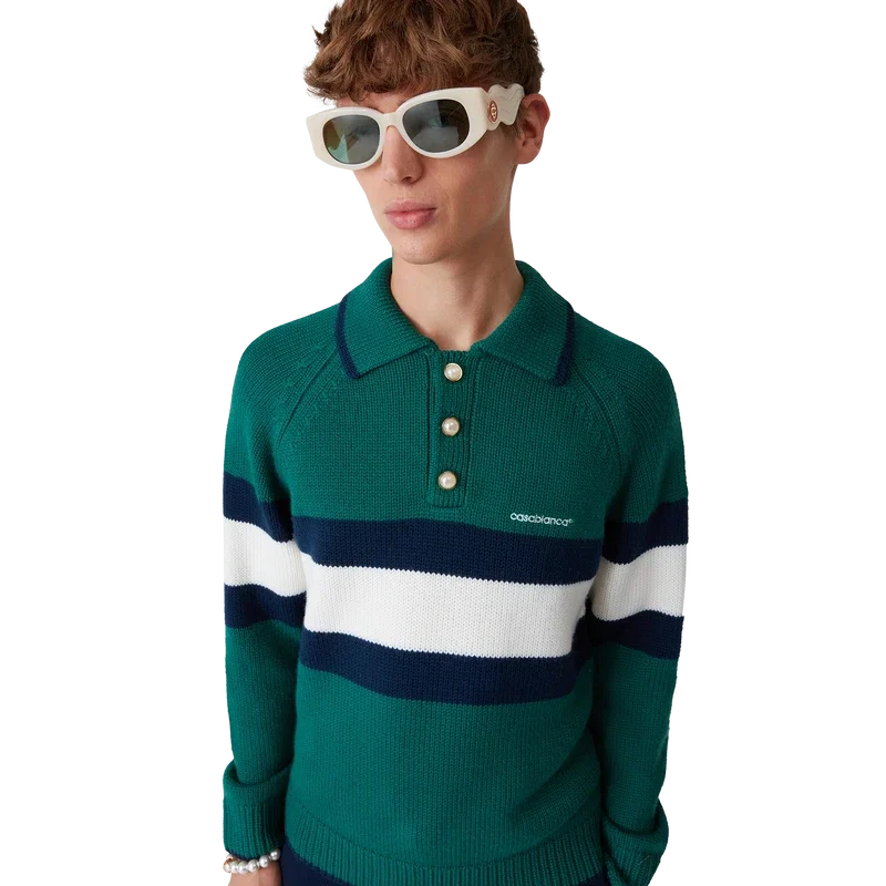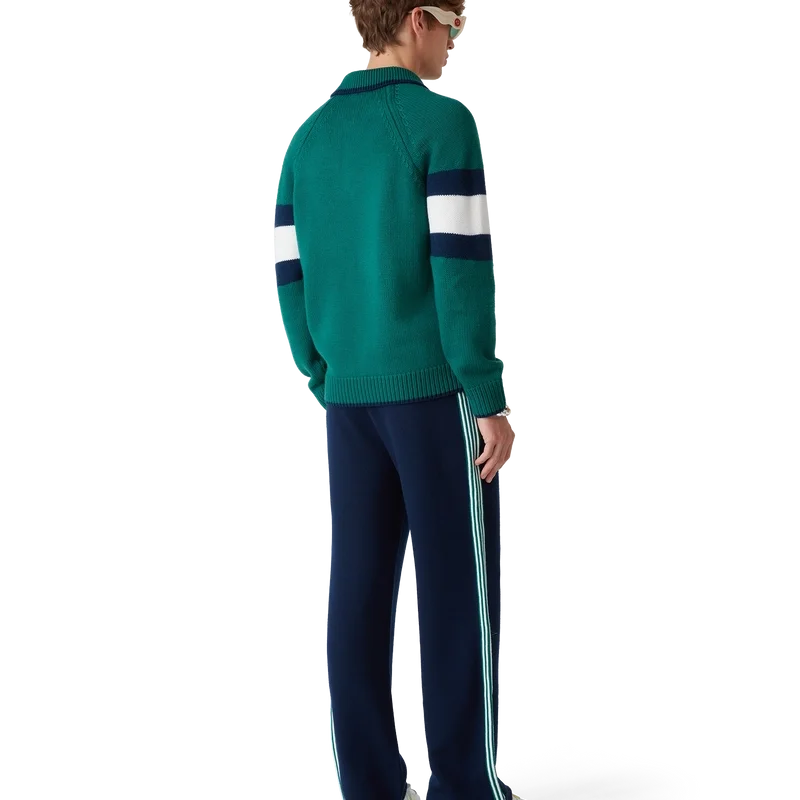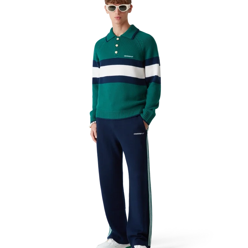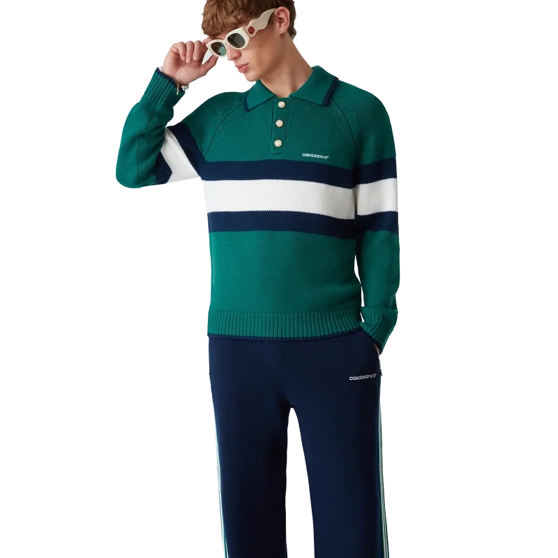 Tricoul polo cu blocuri de culoare este un model cu mâneci lungi, confecționat din țesătură de lână merino și prezintă o dungă albastră și albă pe piept și pe spate. Completat cu mâneci raglan, manșete, tiv și guler cu nervuri, nasturi cu margine aurie și logo Casablanca.