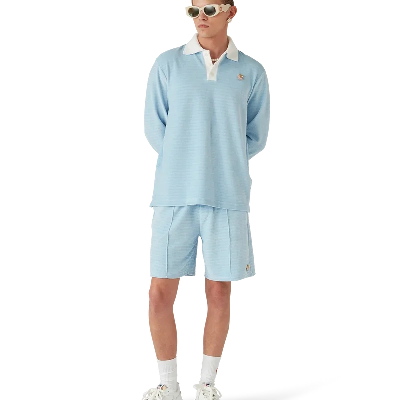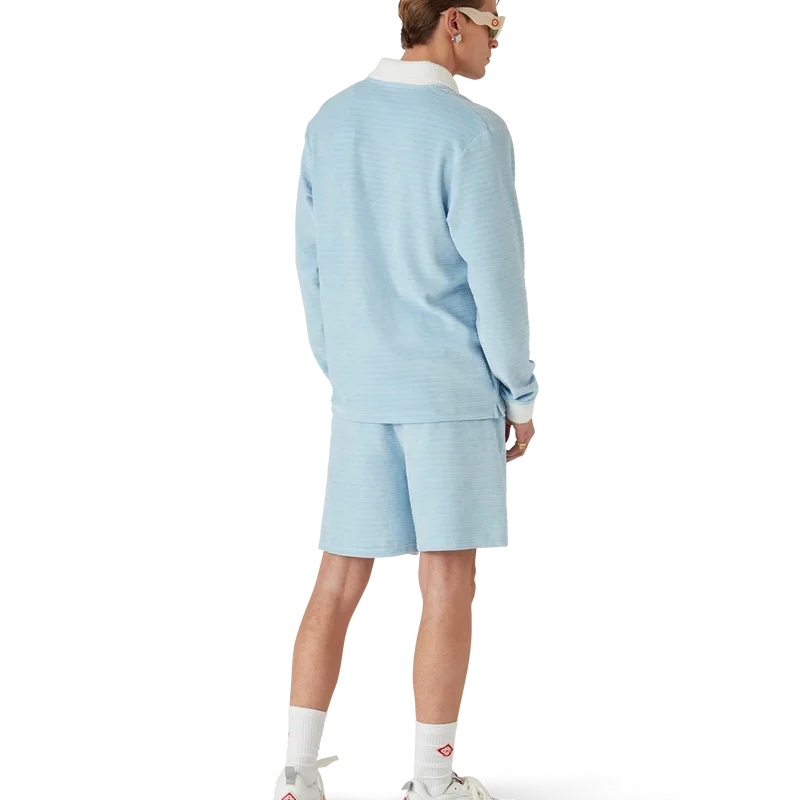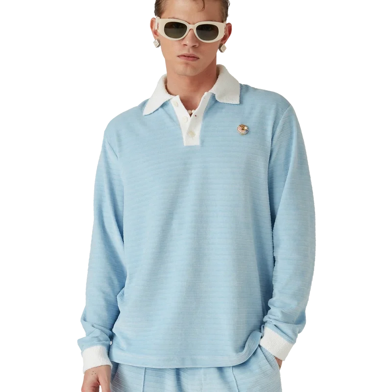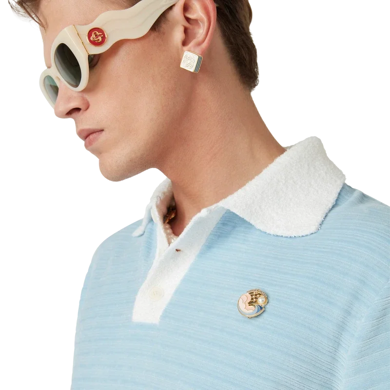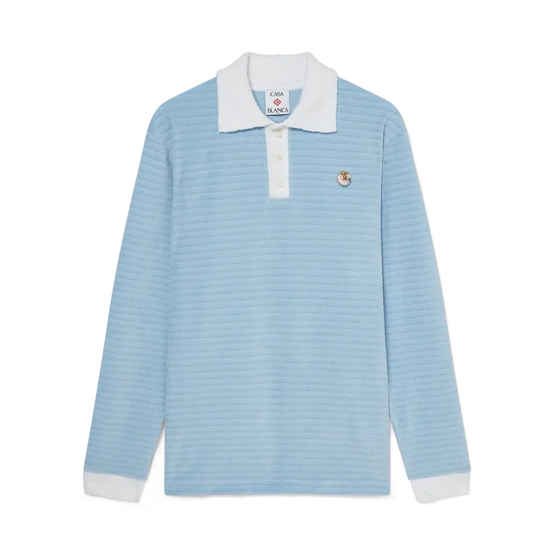 Tricoul polo cu dungi din velur este un model cu mâneci lungi, confecționat din țesătură cu dungi din velur, cu insigna celor patru elemente ale casei. Completat cu nasturi din corozo cu logo-ul Cc intercalat, o placketă cu trei nasturi și o placketă, manșete și guler din rib contrastant.