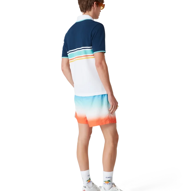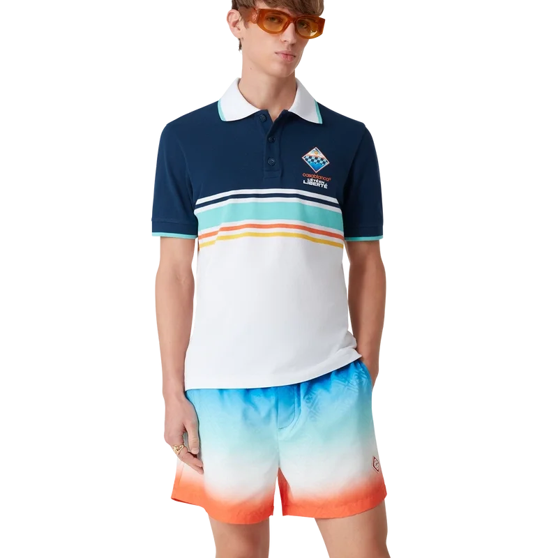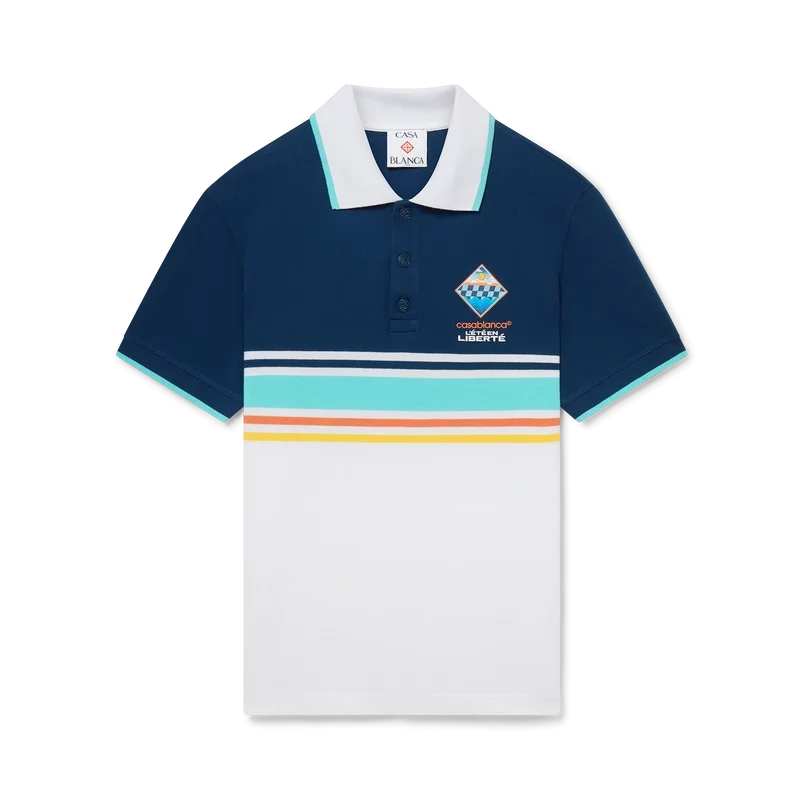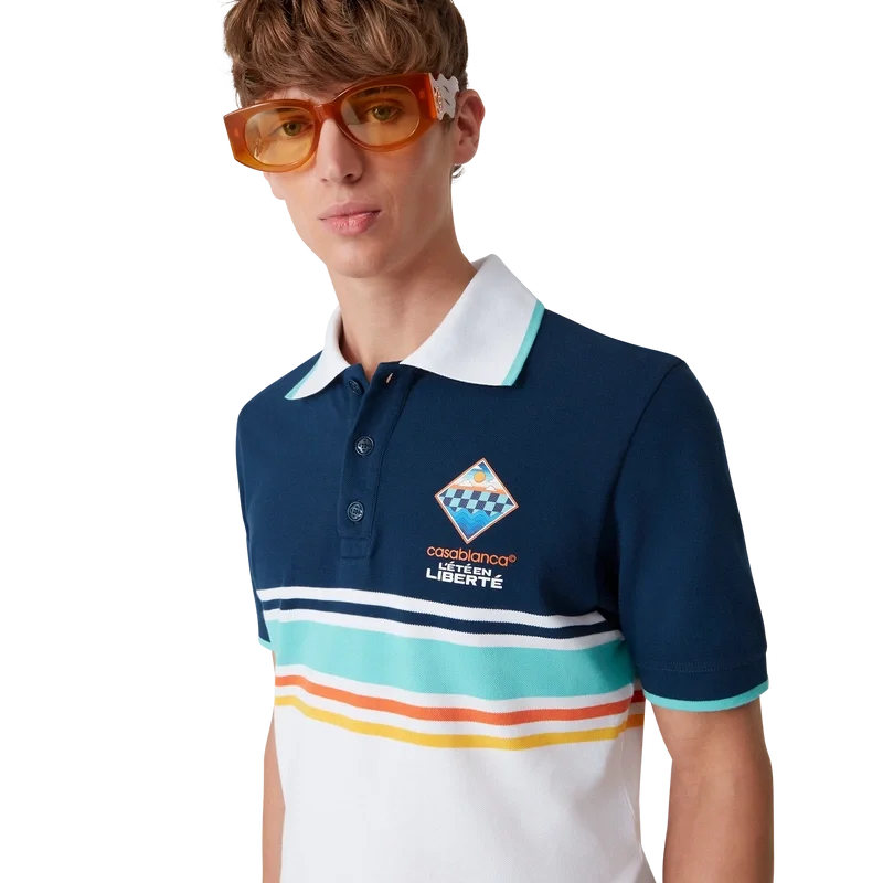 Tricoul polo L’ÉTa En Liberta este un model cu mâneci scurte, confecționat din bumbac organic, prezentând grafica sezonieră a casei de modă sub forma unui patch în formă de romb. Este prevăzut cu o închidere cu trei nasturi cu logo-ul Cc interconectat și nasturi din corozo, un guler cu nervuri cu detalii de margine în nuanța aqua și detalii cu dungi portocalii, galbene, bleumarin, aqua și albe pe piept.
