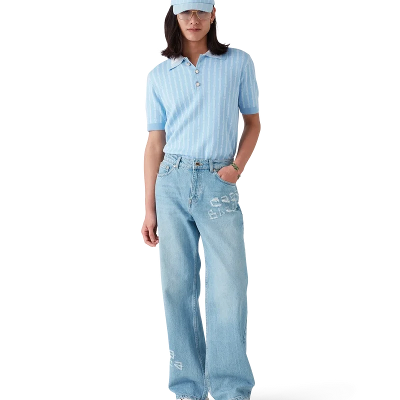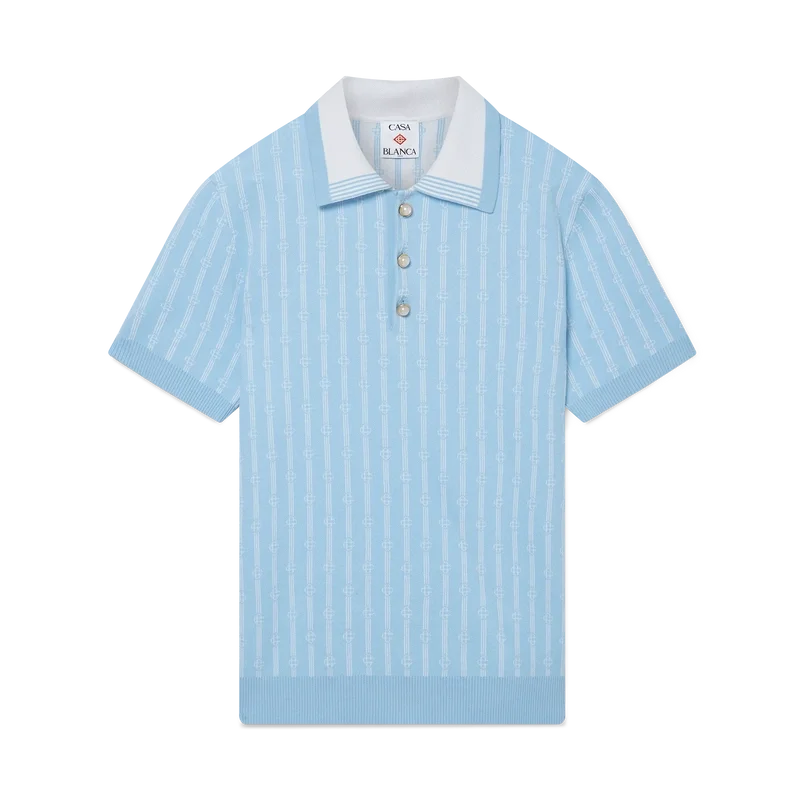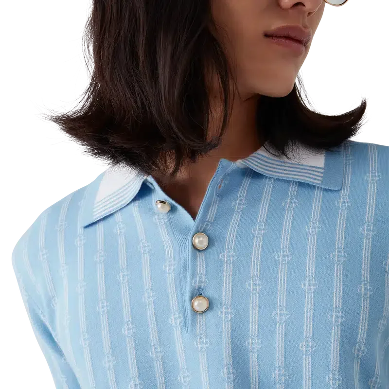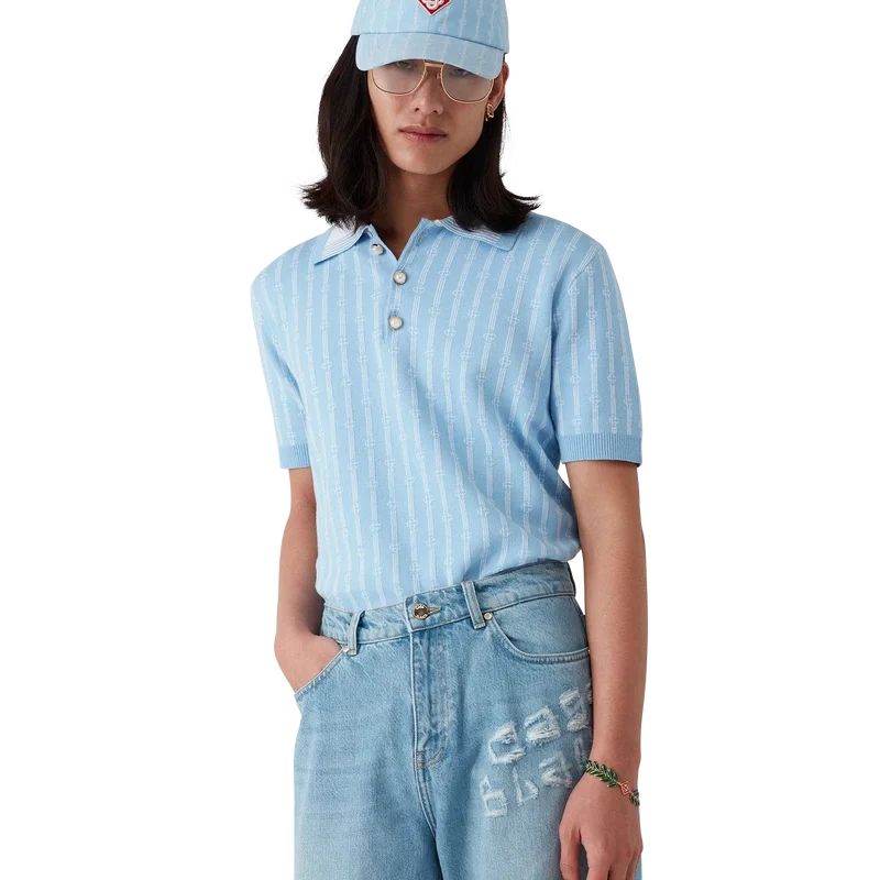 Tricoul polo Monogram este un model cu mâneci scurte, confecționat din țesătură din amestec de bumbac, cu o placket clasică cu trei nasturi. Completat cu nasturi cu margini aurii și perle, semnătura casei, manșete, tiv și guler cu detalii la margini.