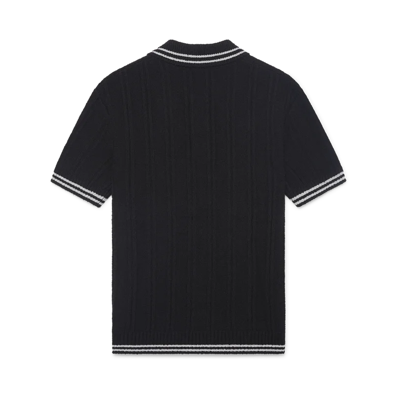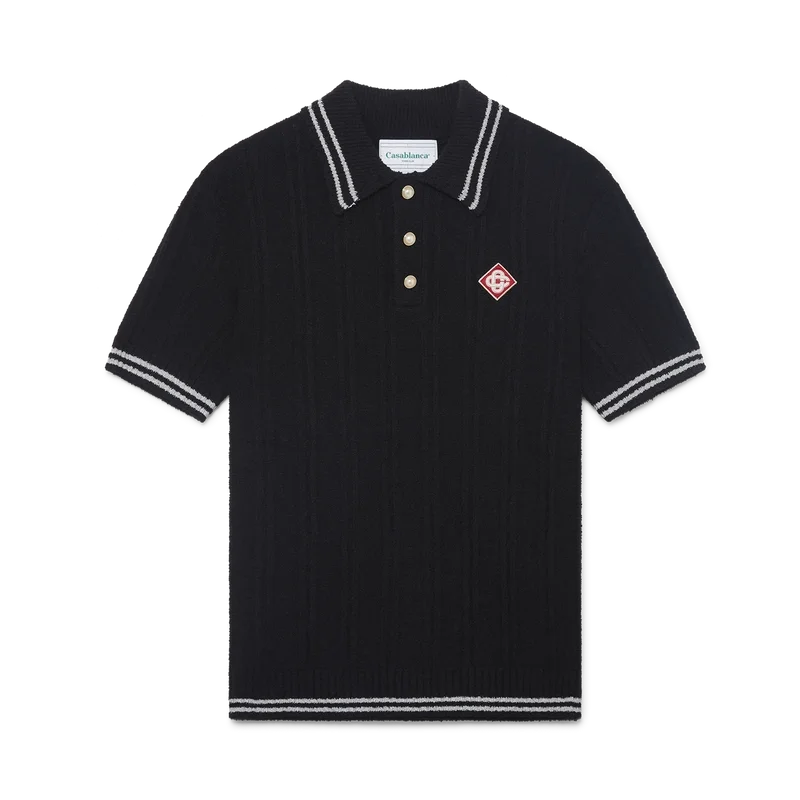 Tricoul polo Boucle cu bordură argintie este un model cu mâneci scurte, confecționat dintr-un material din amestec de bumbac, cu logo-ul diamant caracteristic al casei. Este completat cu nasturi cu margine aurie și perle, detalii pe guler și tiv, precum și guler, manșete, placket și tiv din material cu nervuri.