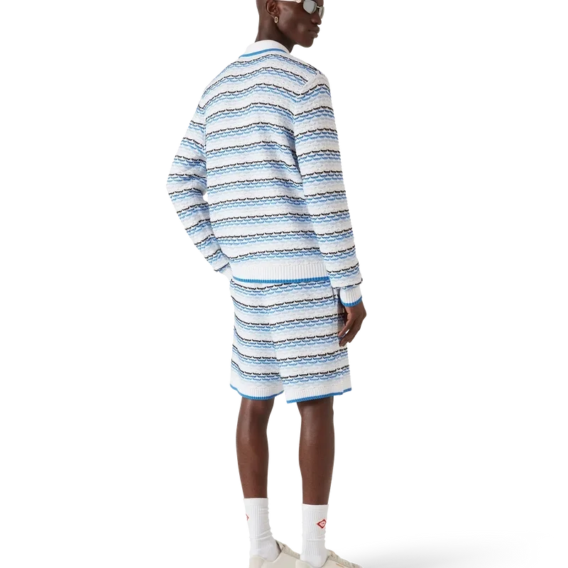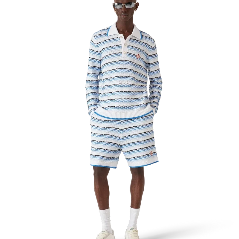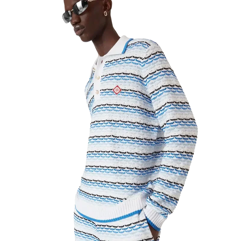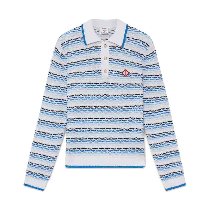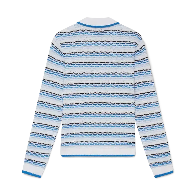 Tricoul polo cu mâneci lungi și cusături pliate este un model tricotat, care prezintă logo-ul diamant caracteristic al casei. Este prevăzut cu închidere cu nasturi, nasturi cu margine aurie și perle, precum și guler, manșete și tiv cu nervuri, cu detalii la margini.