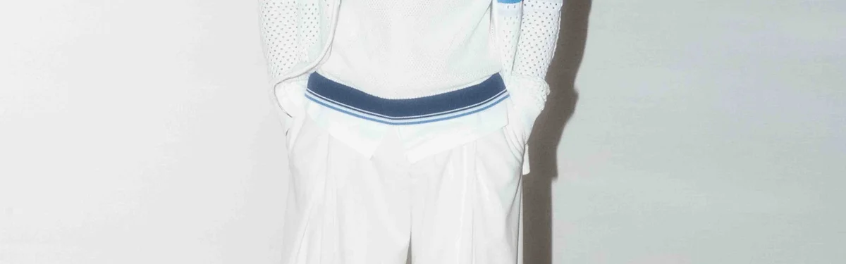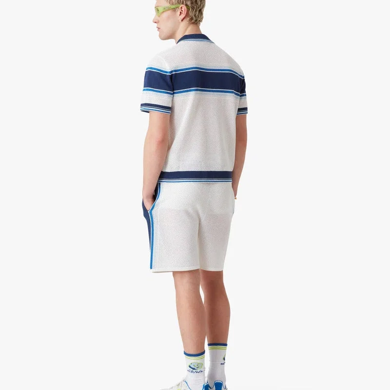 Tricou polo cu pantaloni scurți din plasă cu dungi are un design rafinat, cu o dungă albastră pe piept, mâneci și spate. Este completat cu guler, manșete și tiv cu detalii cu margini în dungi, închidere cu nasturi și nasturi cu margine aurie și perle, caracteristice mărcii.