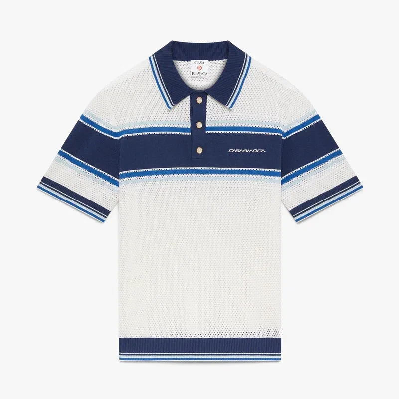 Tricou polo cu mâneci scurte din plasă cu dungi albe și albastre