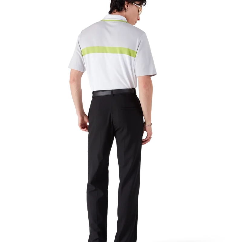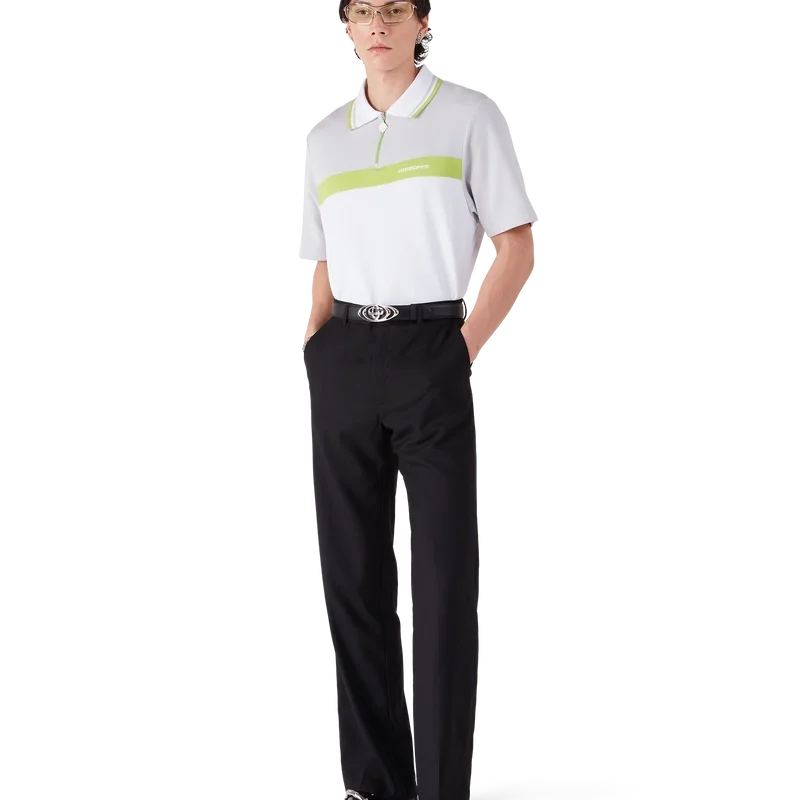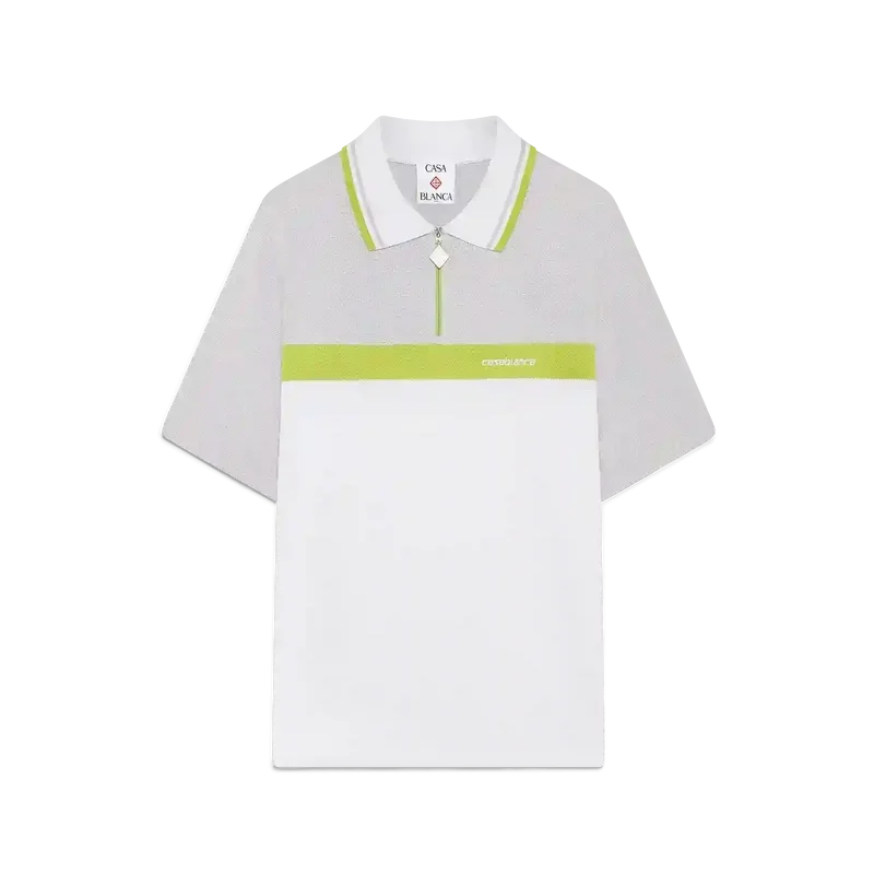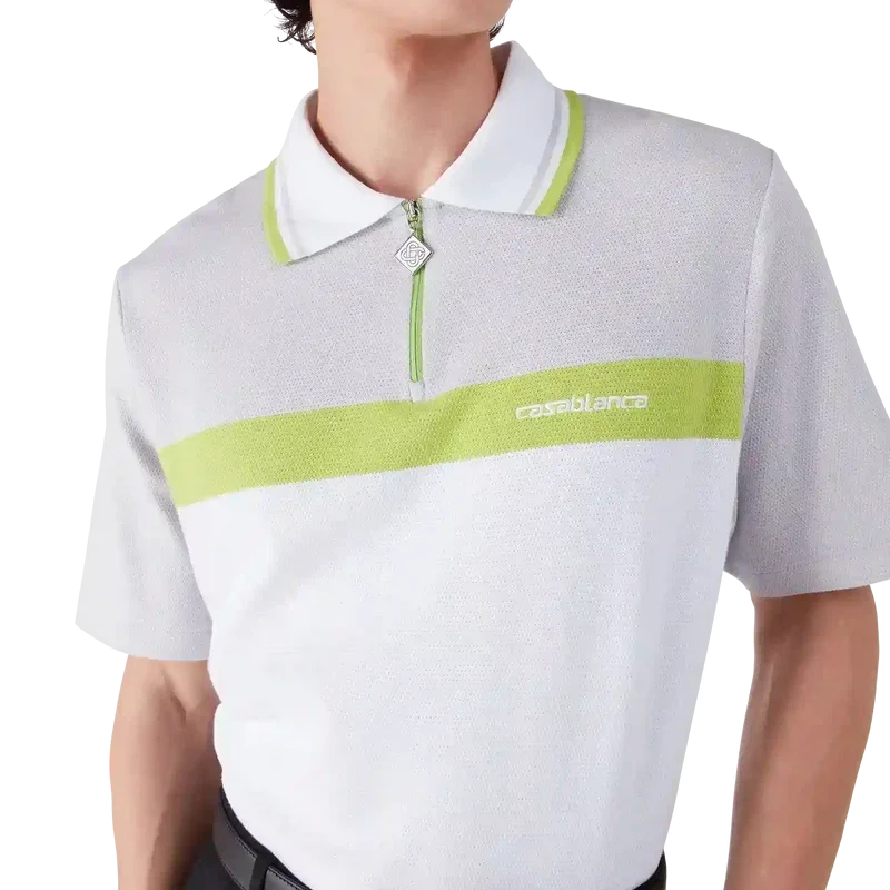 Tricoul polo cu mâneci scurte are un design rafinat, cu logo-ul Casablanca al casei de modă, întruchipând abordarea distinctivă a acesteia în materie de îmbrăcăminte sport de lux. Este completat de un bloc cromatic gri și alb, un guler clasic cu nervuri, o închidere cu fermoar prevăzută cu un tirant cu logo-ul în formă de diamant al casei de modă și o siluetă lejeră.