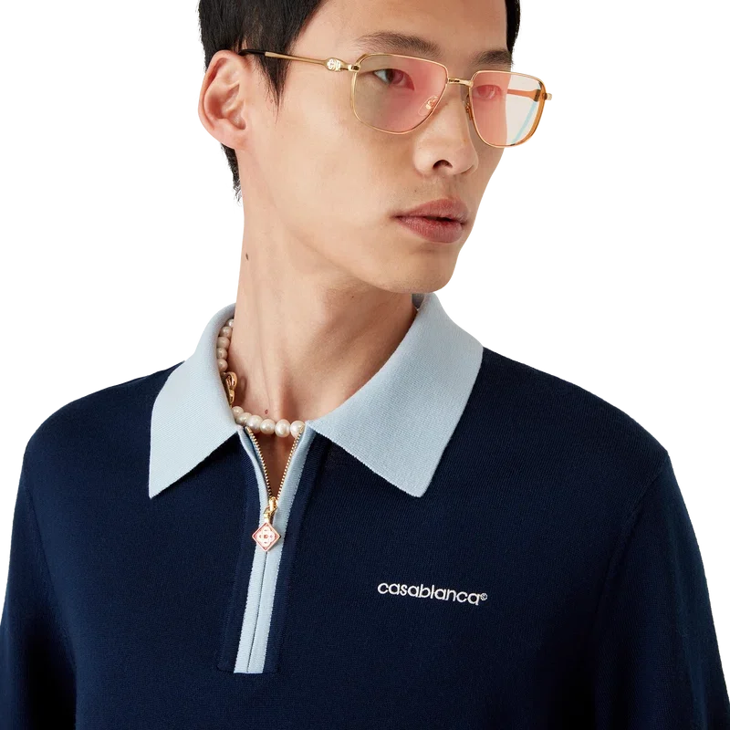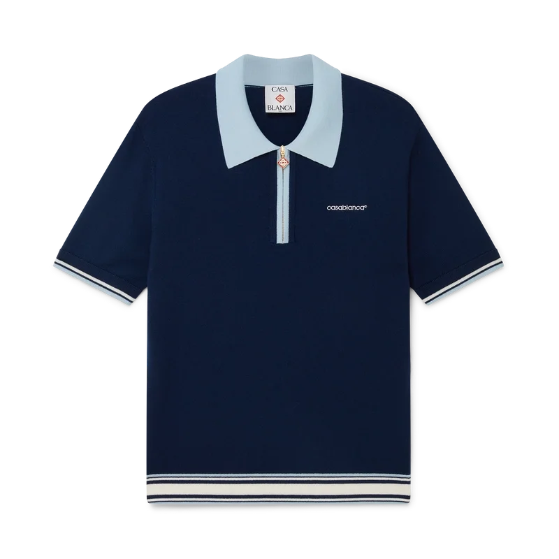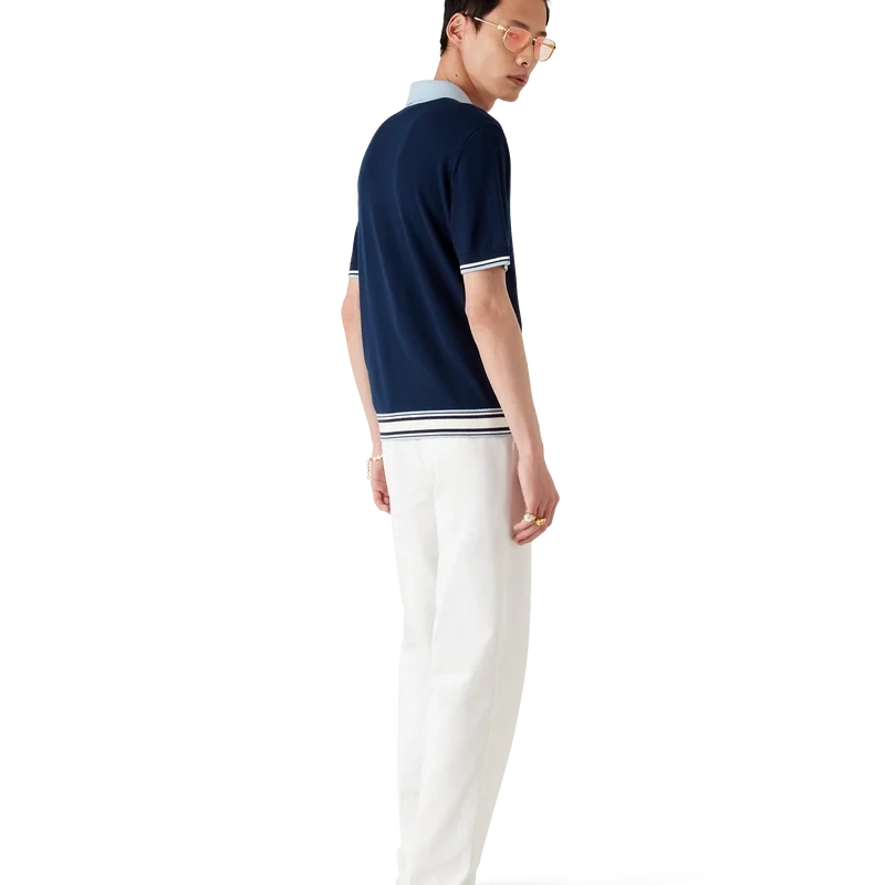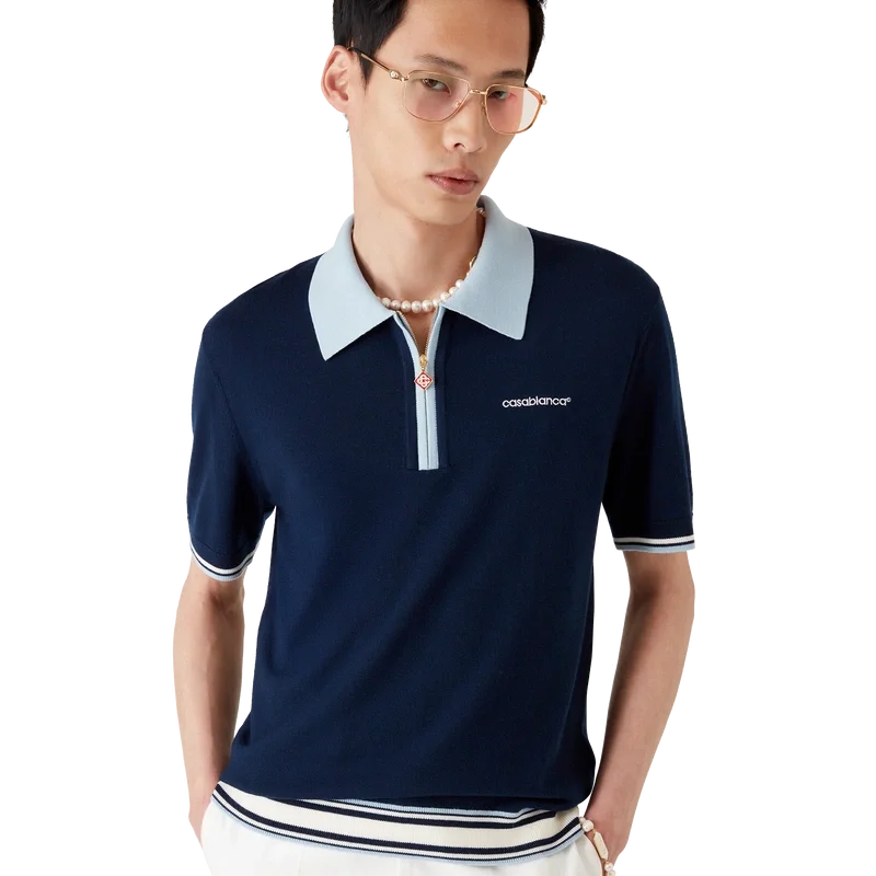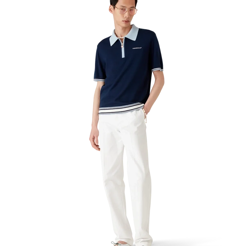 Pantalon de tenis cu mâneci scurte din lână merino este un model tricotat, confecționat din țesătură de lână merino. Prezintă închidere cu fermoar, știft de fermoar cu logo-ul diamant caracteristic, detalii cu dungi la tiv și manșete, guler și placket cu nervuri în contrast și logo-ul Casablanca al casei.