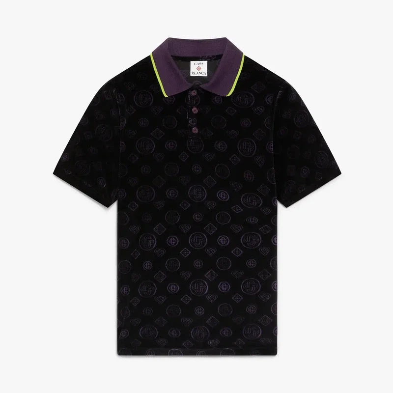 Tricoul polo din velur cu monogramă violet este un model cu mâneci scurte, confecționat din țesătură de velur, cu modelul iconic Monogram al casei imprimat pe toată suprafața. Completat cu un logo Diamond argintiu, guler cu nervuri și detalii contrastante la margini, închidere cu nasturi și nasturi Corozo cu logo-ul Cc intercalat.