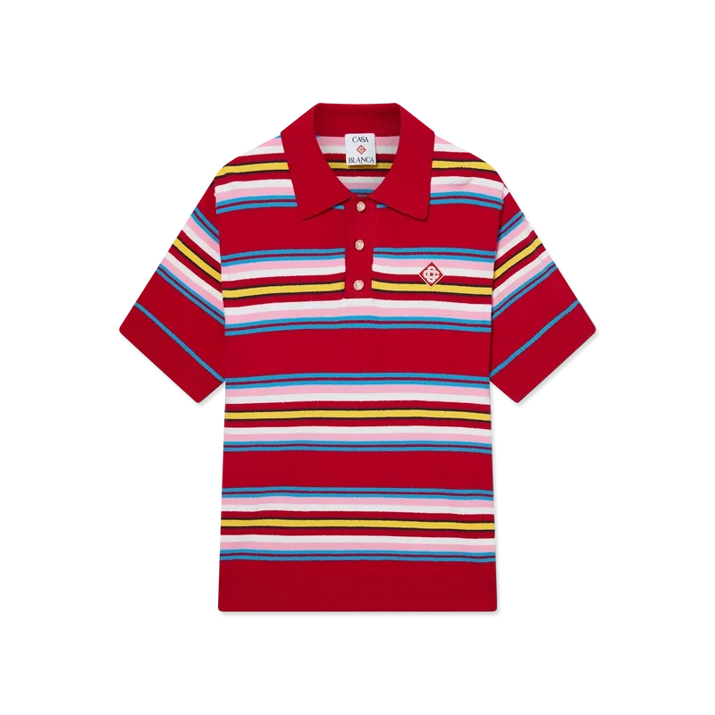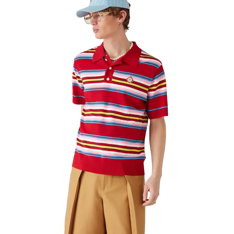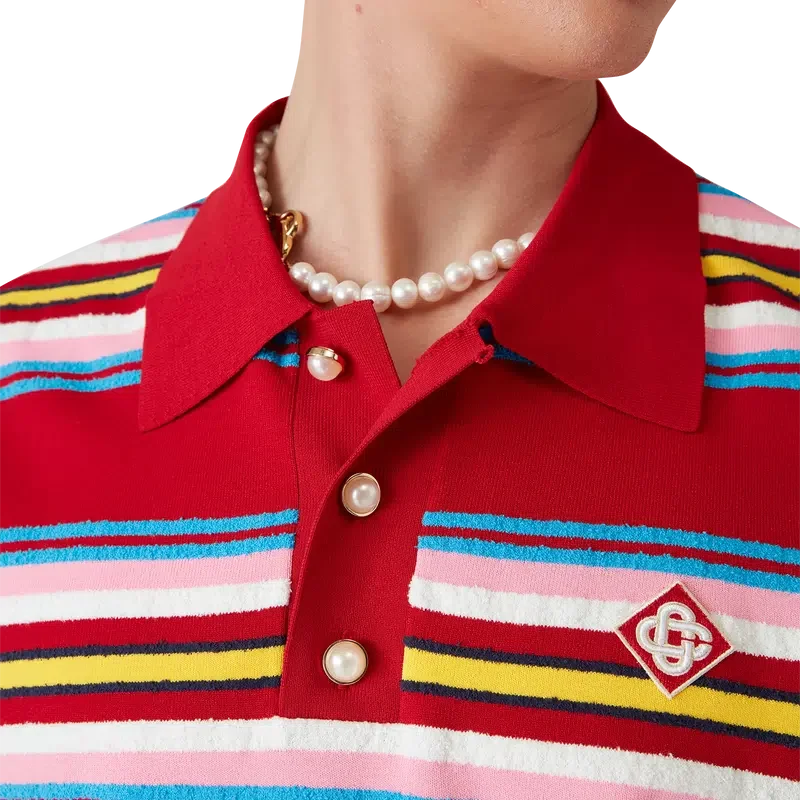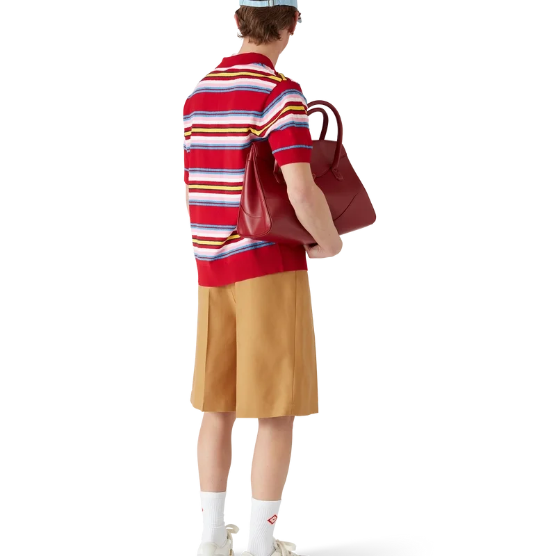 Tricoul polo oversized cu dungi este un model cu mâneci scurte, confecționat din țesătură tricotată cu dungi, cu logo-ul în formă de diamant, semnătura casei. Completat cu nasturi cu margini aurii și perle, caracteristici ale casei, cu trei nasturi, manșete, tiv, guler și placket din tricot cu nervuri.