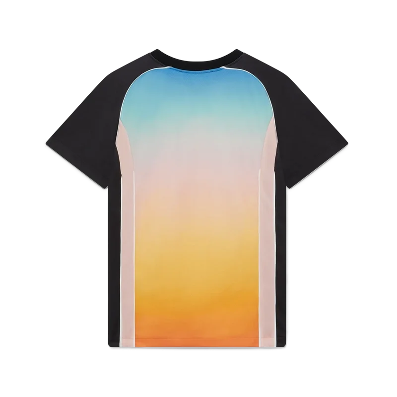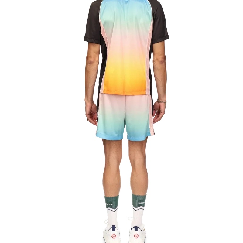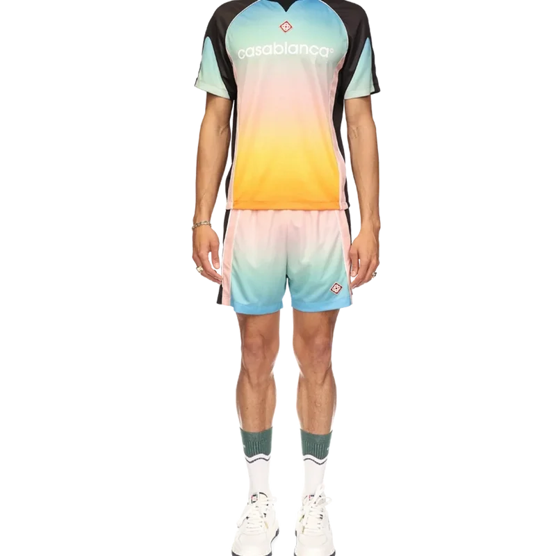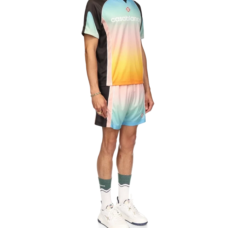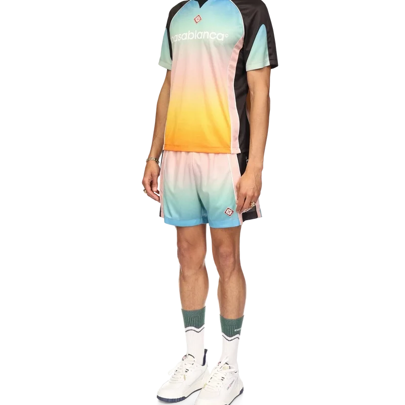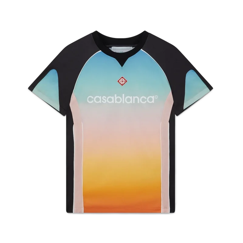 Cămășa de fotbal cu gradient pastel este un articol sportiv cu mâneci scurte, caracterizat printr-o serie de culori pastelate în gradient, care subliniază temele eterice esențiale pentru brandul nostru. Confecționat din plasă Birdseye și completat cu patch-ul cu logo-ul diamant caracteristic casei și logo-ul Casablanca pe piept, cu guler clasic rotund.