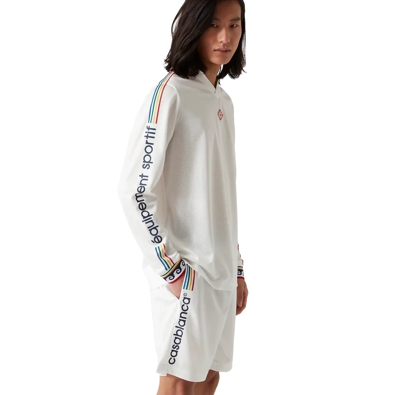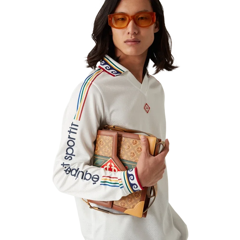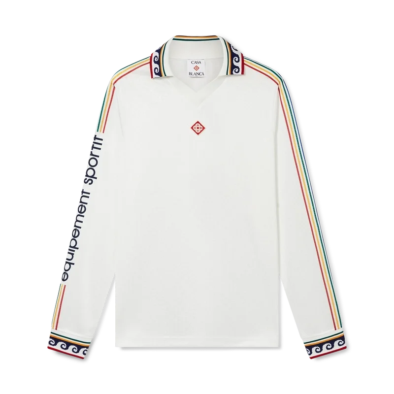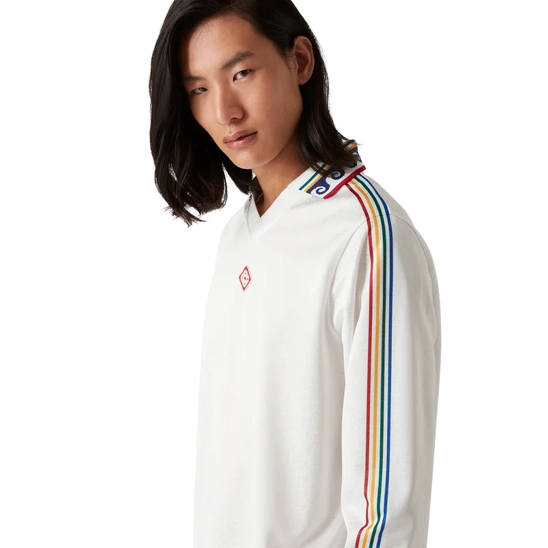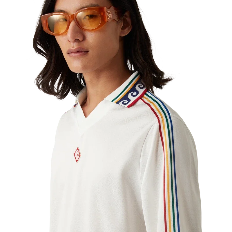 Cămășa de fotbal cu monogramă Jacquard este un model cu mâneci lungi și imprimeu integral, prezentând monograma Cc interconectată a casei, confecționat dintr-o țesătură cu monogramă Jacquard. Completat cu guler și manșete din tricot, logo-ul Casablanca pe mâneci și logo-ul Diamond Monogram la guler.