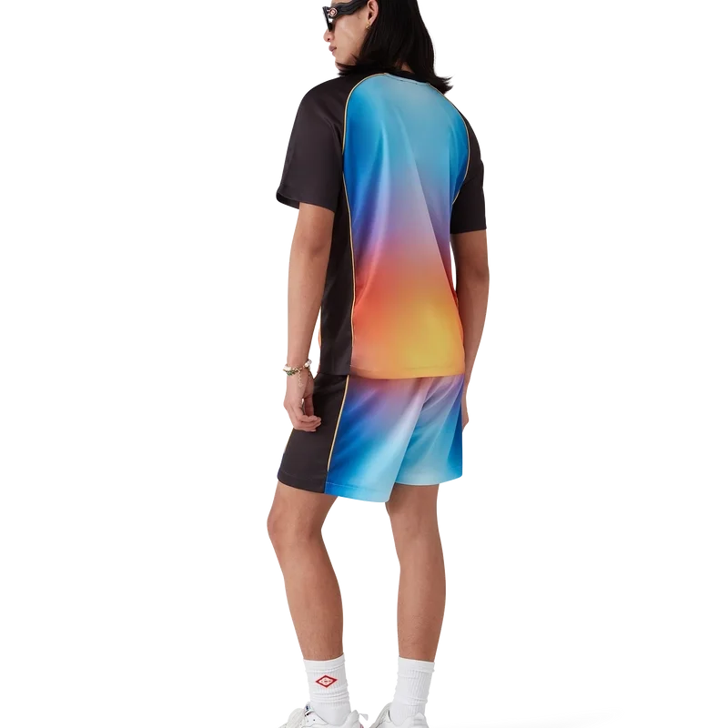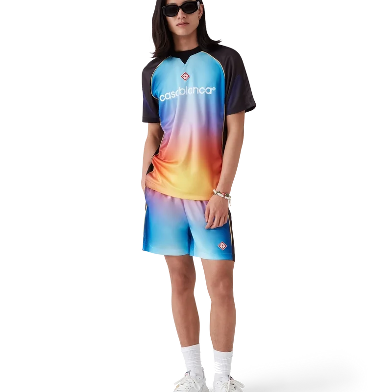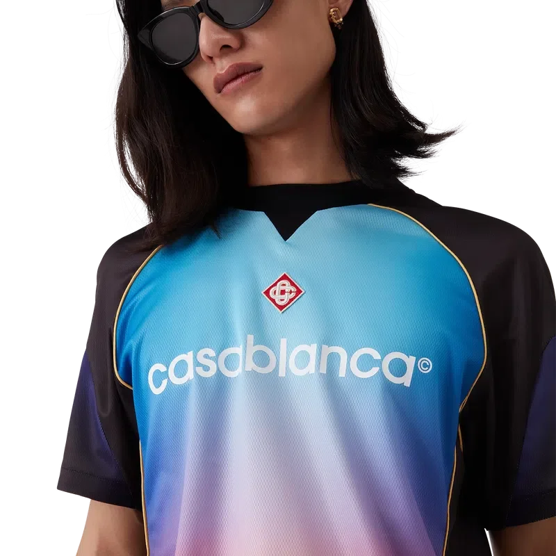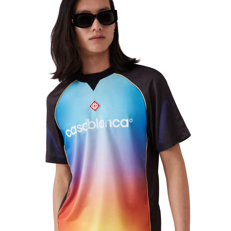 Cămășa de fotbal Gradient este un articol sportiv cu mâneci scurte, confecționat din țesătură tip plasă Birdseye imprimată, prezentând o serie de culori vibrante care reprezintă o interpretare futuristă a gradientului Casablanca, o formă de halou inspirată de afișele și discurile vintage de science-fiction. Completat cu patch-ul cu logo-ul diamant caracteristic casei și logo-ul Casablanca pe piept, cu guler clasic rotund.