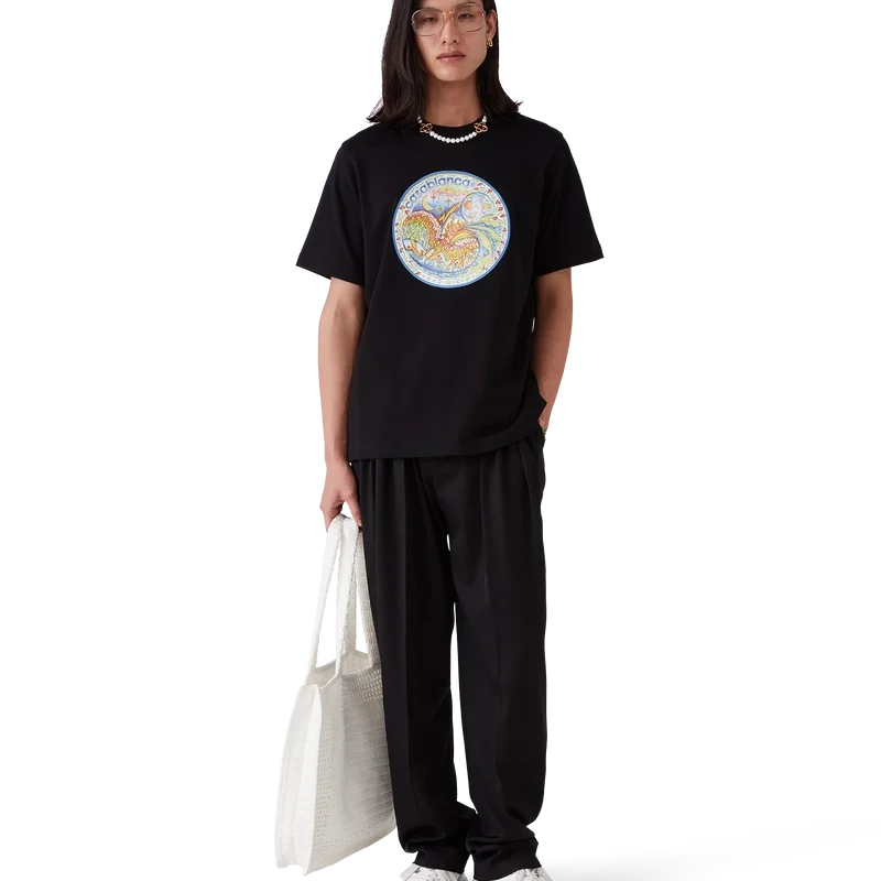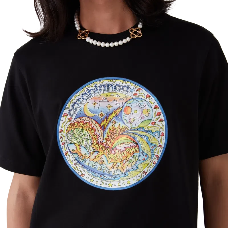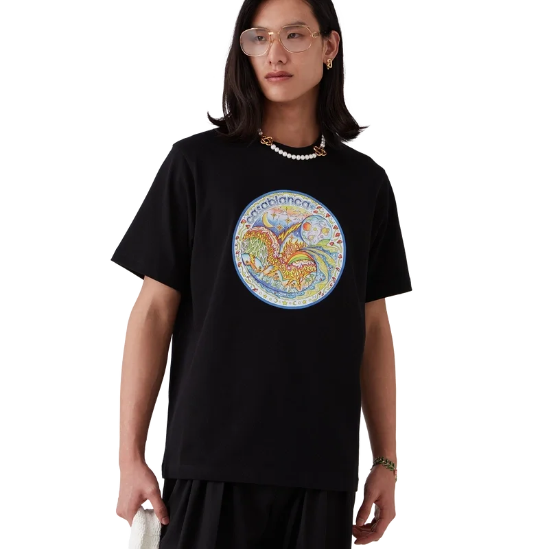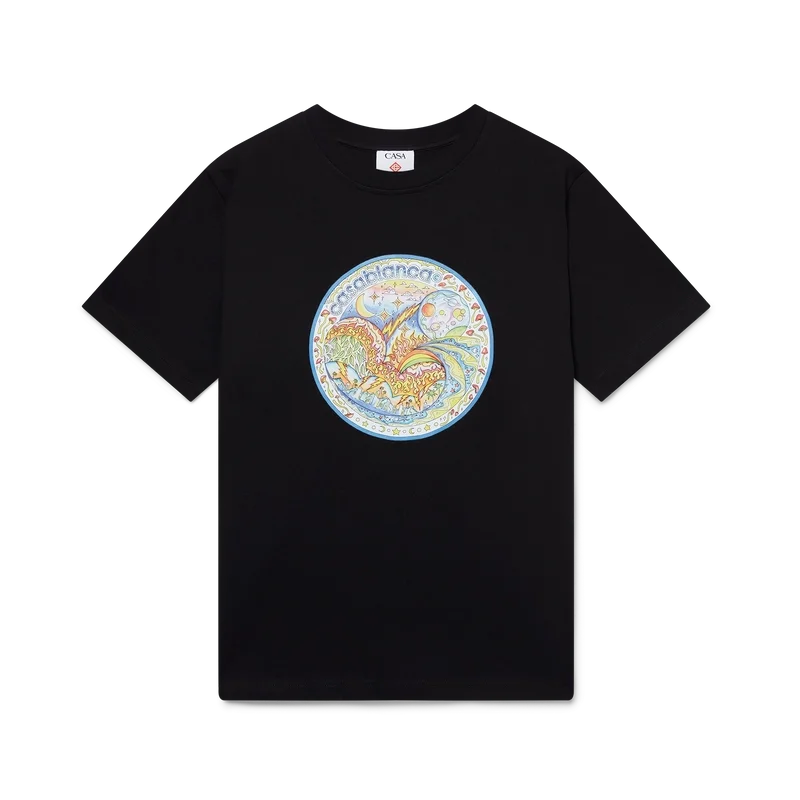 Tricou „The Four Elements” este un model cu mâneci scurte, imprimat, confecționat din țesătură de bumbac organic și prezintă un imprimeu cu grafică distinctivă care reunește toate elementele La: orizontul, plaja, focul, vegetația și astronomia. Completat cu un guler rotund clasic.