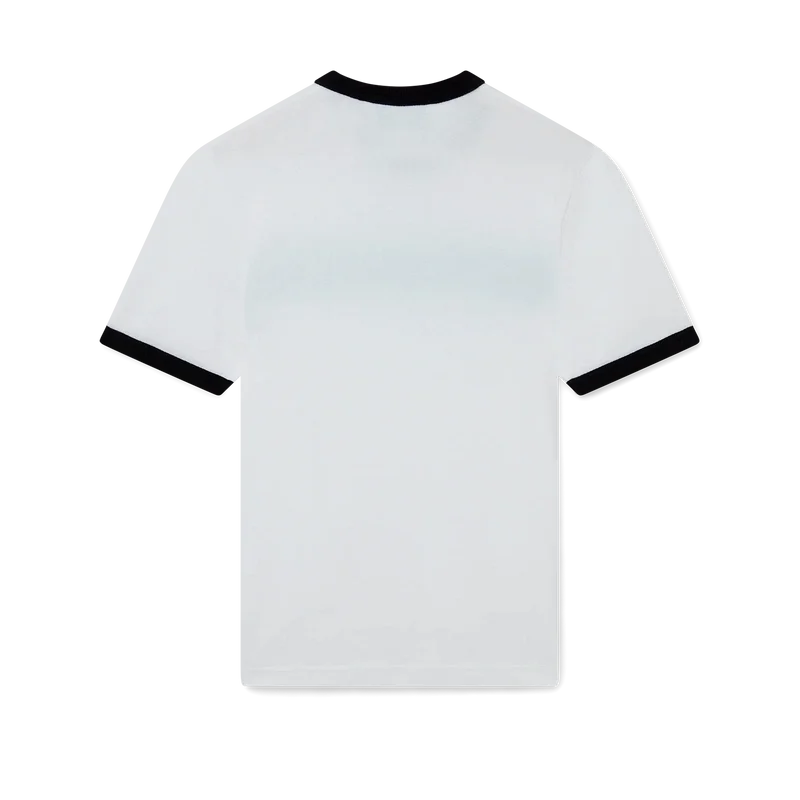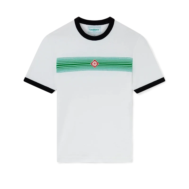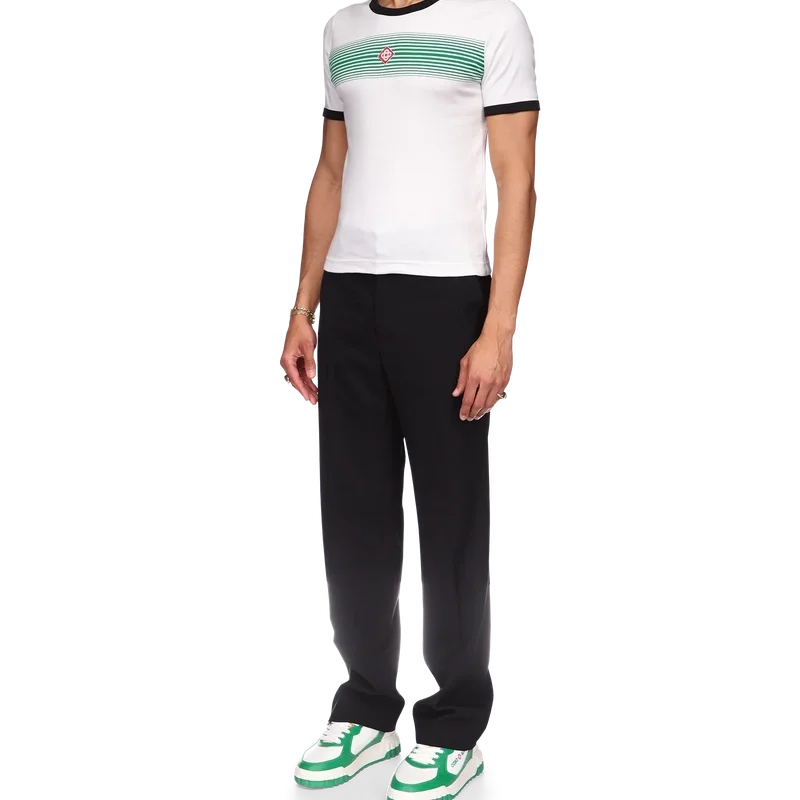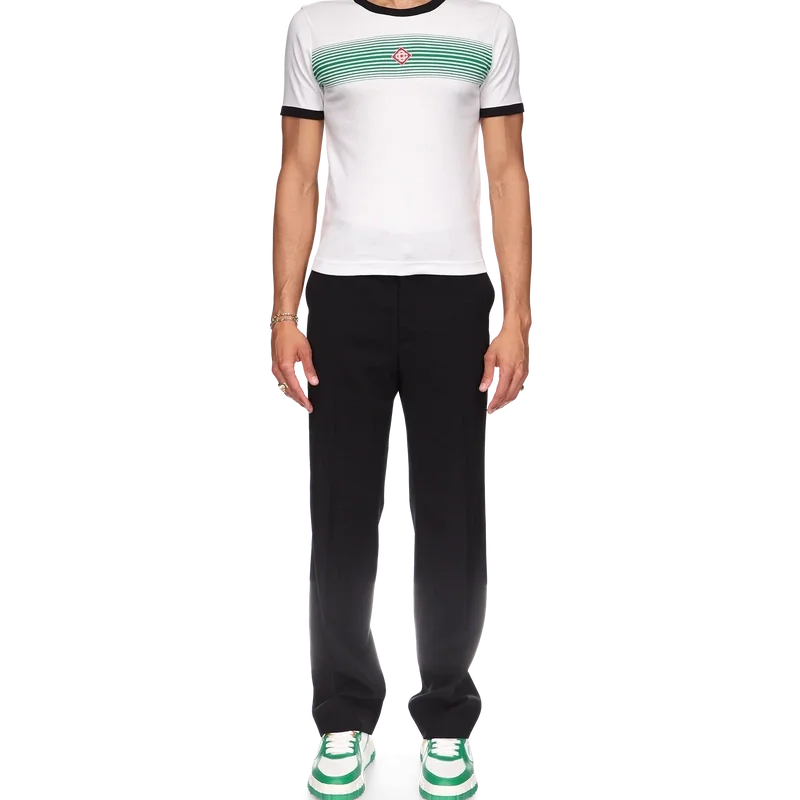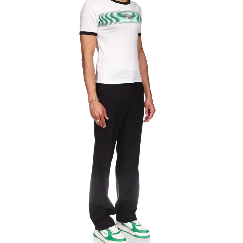 Tricou cu dungi degradate și guler întoars este un model ajustat, inspirat de culorile steagului nigerian și prevăzut cu aplicația cu logo-ul în formă de diamant al casei. Confecționat dintr-un material din bumbac organic și finisat cu un guler clasic rotund, cu guler și manșete din tricot cu nervuri în contrast.