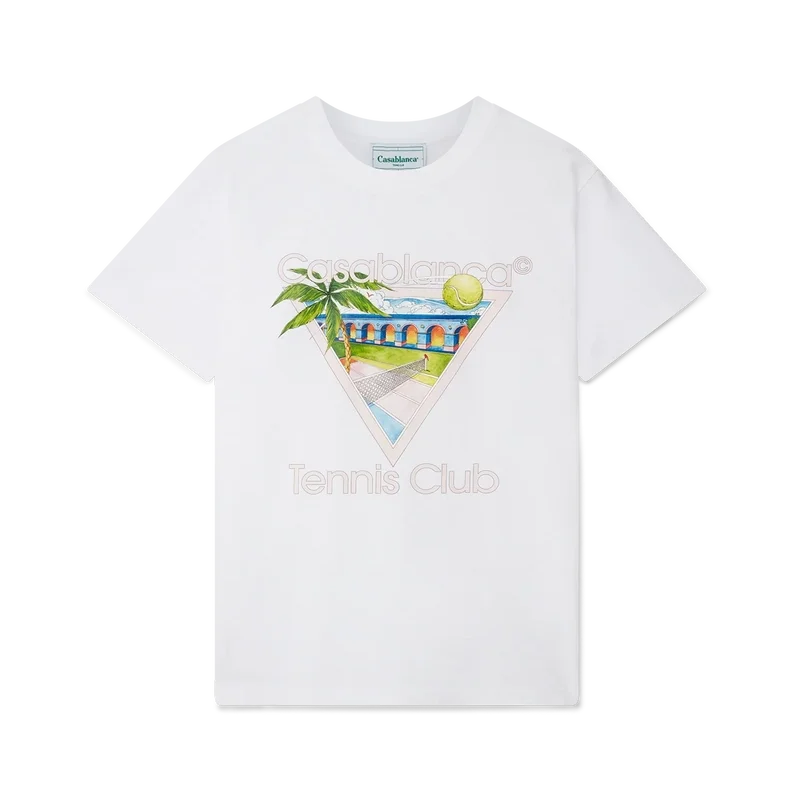 Tricoul Tennis Club Icon este un design serigrafiat cu grafica emblematică a casei, reinterpretată pentru acest sezon, incorporând elemente de tenis, natură și arhitectură. Confecționat din jersey alb și completat cu un guler rotund clasic și o etichetă cu marca Casablanca.