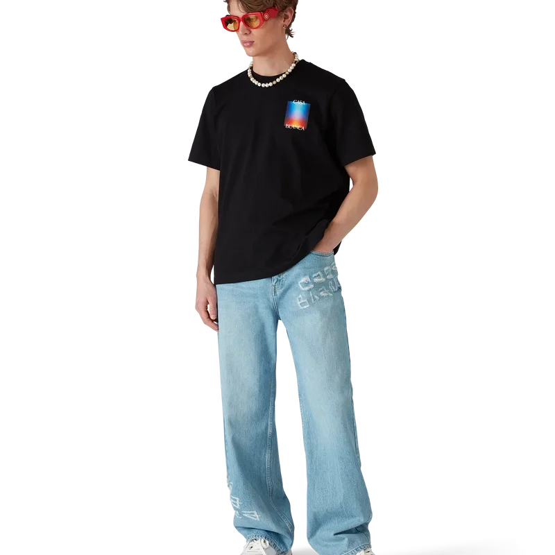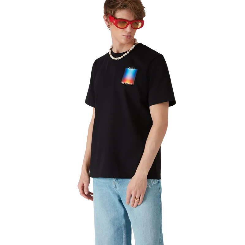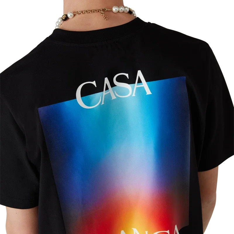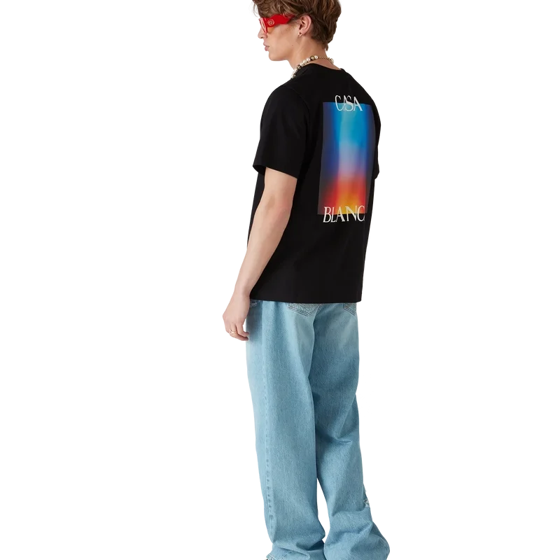 Tricou cu logo-ul Gradient Casa este un model cu mâneci scurte, imprimat, confecționat din bumbac organic, prezentând gradientul sezonier al casei, inspirat de o interpretare futuristă a gradientului Casablanca: o formă de halou inspirată de afișele și discurile vintage de science-fiction. Completat cu un guler clasic rotund.
