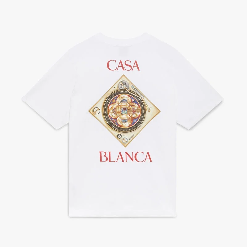 Tricou cu mâneci scurte Plafond Orne De Musique, de culoare albă, are un design rafinat, cu un imprimeu inspirat de tavanele renascentiste pictate în mod elaborat și complex, care ilustrează temele atemporale ale muzicii și dansului. Este completat de un guler clasic rotund.