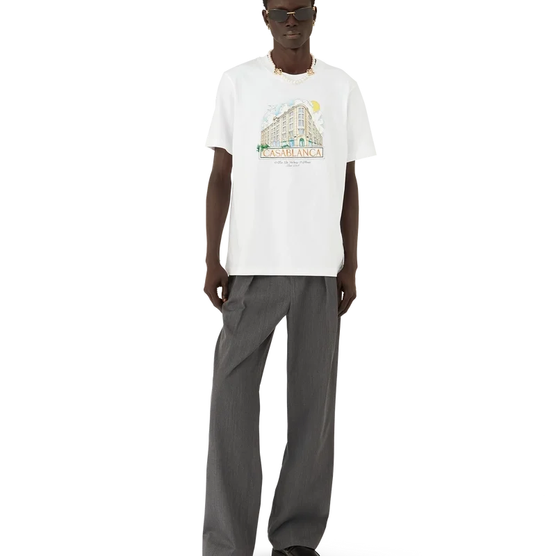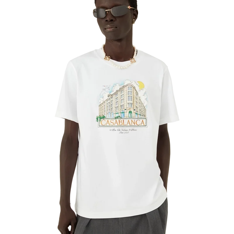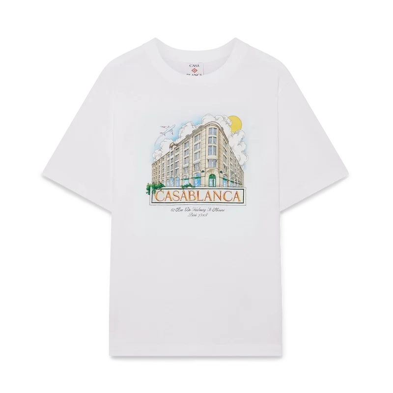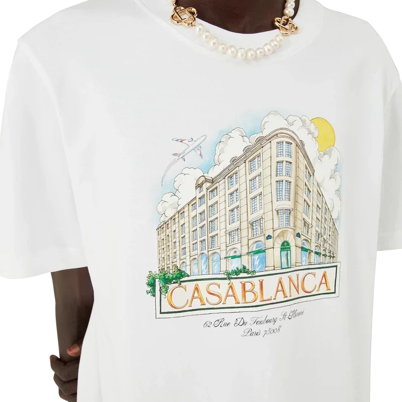 Tricou cu pantaloni scurți imprimat Paris Store are un stil clasic, fiind conceput exclusiv pentru magazinul nostru principal. Prezintă un imprimeu inspirat de arhitectură, natură și călătorii, reprezentând magazinul nostru din Paris, situat pe Rue Du Faubourg Saint-Honoré, una dintre cele mai istorice străzi din lume pentru modă și design și un simbol al eleganței și rafinamentului francez. Completat cu un guler rotund clasic. Această piesă este disponibilă exclusiv pe Casablancaparis.Com și în magazinul nostru din Paris.