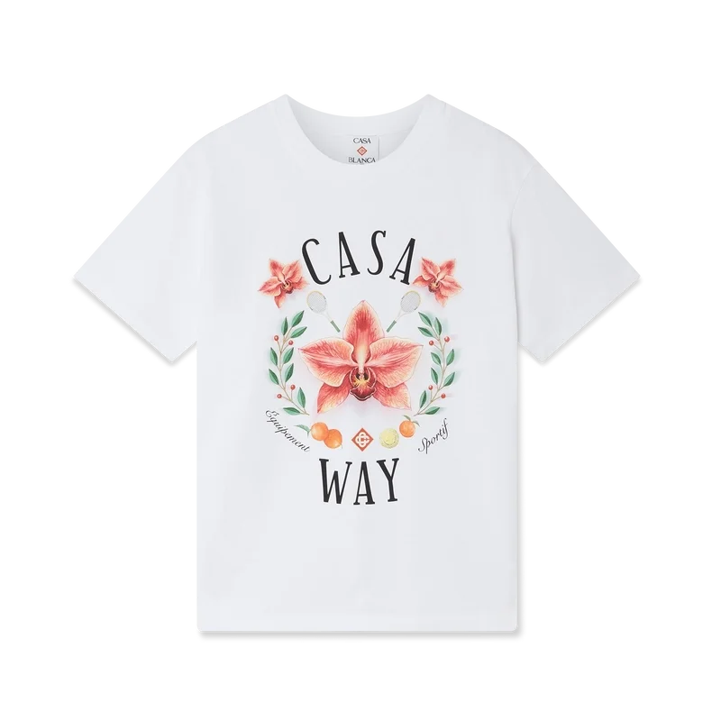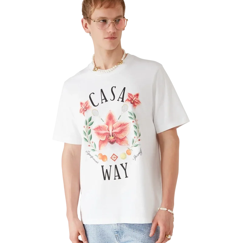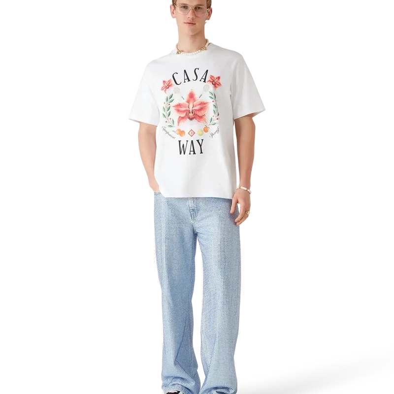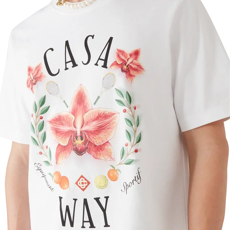Tricou Casa Way Orchid este un model rafinat cu mâneci scurte și imprimeu artistic, având orhideea ca floare a sezonului. Completat cu un guler rotund clasic.
