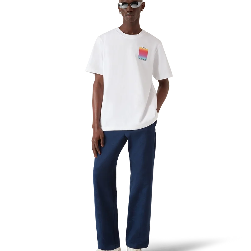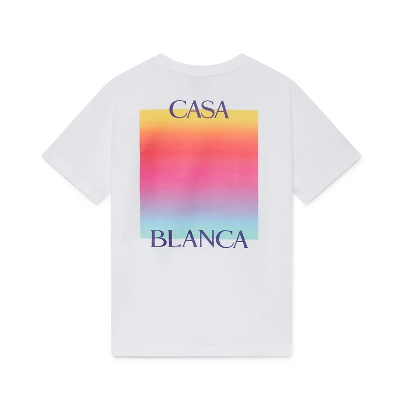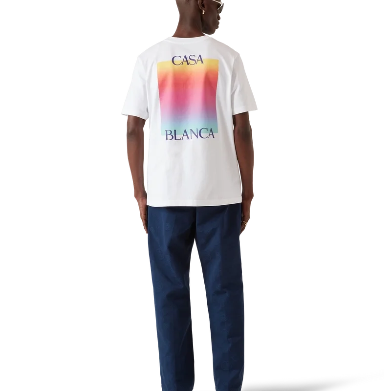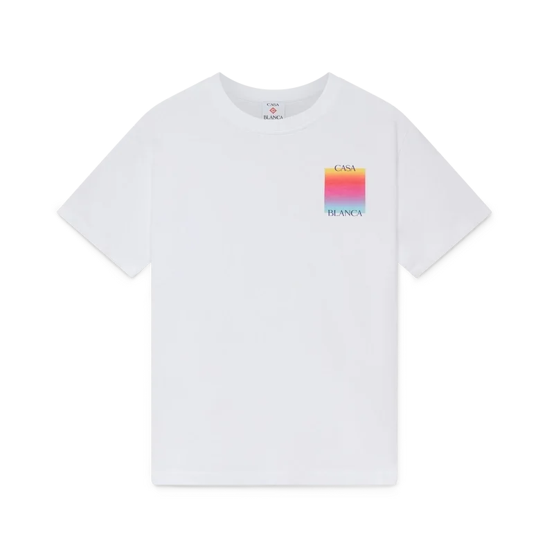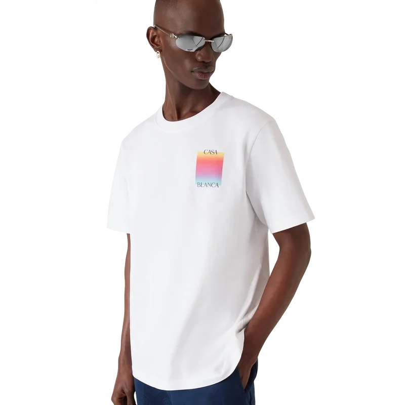 Tricou cu mâneci scurte și logo pătrat în degrade este un model cu mâneci scurte, care prezintă logo-ul suprapus al casei de modă și pătratul în degrade al sezonului. Este completat de un guler rotund clasic și o siluetă lejeră.