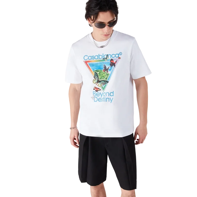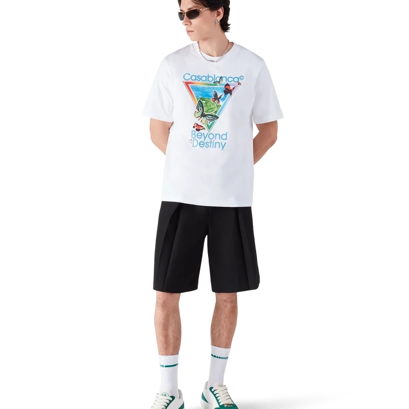 Tricoul cu mâneci scurte Tennis Club Icon Beyond Destiny este un model rafinat, cu mâneci scurte, care prezintă viziunea noastră asupra clasicului tricou de mătase Casablanca Souvenir, reimaginat prin prisma artei digitale. Elementele digitale se îmbină cu cele organice, cu fluturi pictați manual și peisaje insulare de vis. Completat cu un guler clasic cu nervuri.
