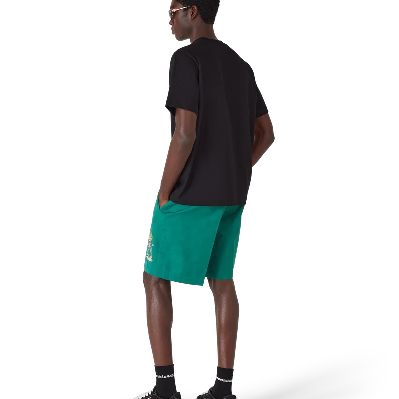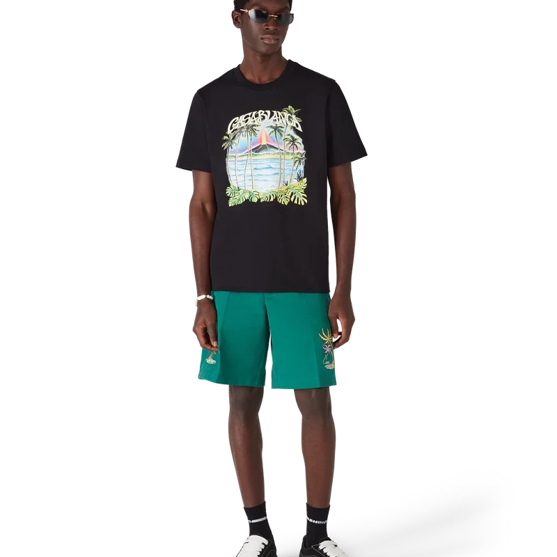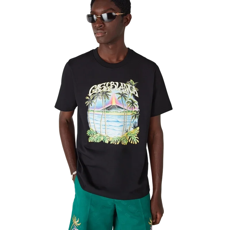 Tricou clasic cu imprimeu Volcano are un design rafinat, prezentând o ilustrație a unui vulcan care se profilează dramatic în spatele unor palmieri în siluetă, în plină erupție, energia sa aprinsă contrastând puternic cu scena senină și liniștită din prim-plan. Completat cu un guler rotund clasic, pantaloni scurți și o siluetă relaxată care întruchipează abordarea sofisticată a mărcii în materie de îmbrăcăminte casual.