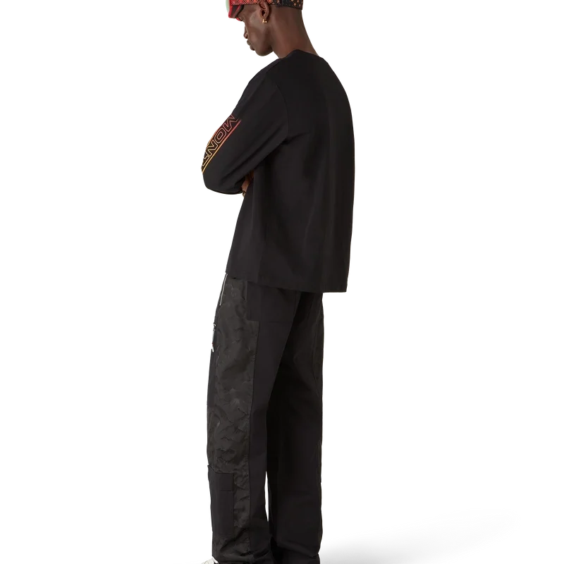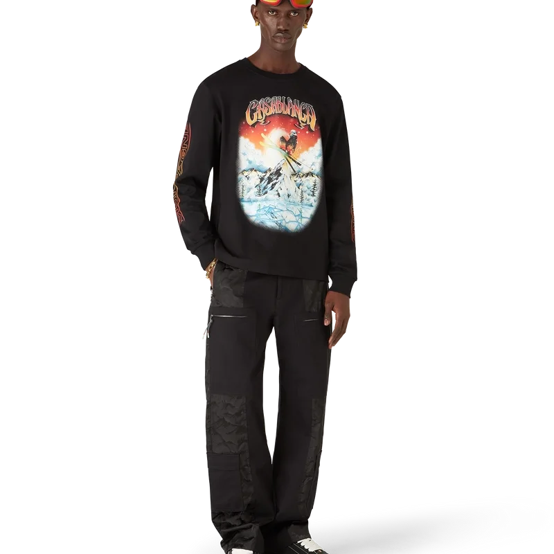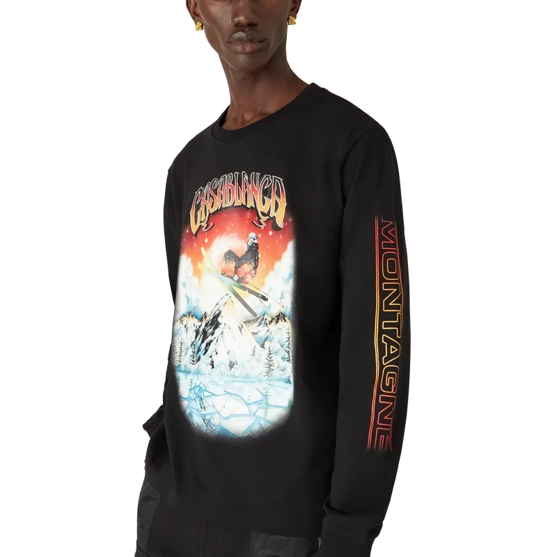 Tricou cu mâneci lungi Ski este un model rafinat Apras-Sport, confecționat din bumbac organic jersey de culoare neagră, inspirat de frumusețea naturală a naturii, reprezentată de soarele apus în culori vibrante peste conturul zimțat al siluetei vârfului muntelui. Gradientul roșu aprins al cerului accentuează intensitatea dramatică a peisajului alpin. Prezintă imprimeul Montagne pe mâneci într-un gradient portocaliu exploziv.