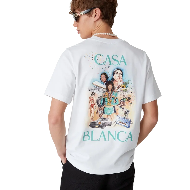 Tricoul Celebration Du Sport este un model cu mâneci scurte și imprimeu, confecționat din țesătură de bumbac organic, cu un design sezonier inspirat de interpretarea casei noastre asupra unui afiș de film clasic, cu personajele noastre în acea lume. Completat cu un guler rotund clasic.