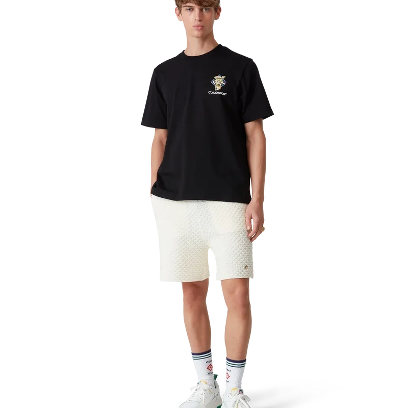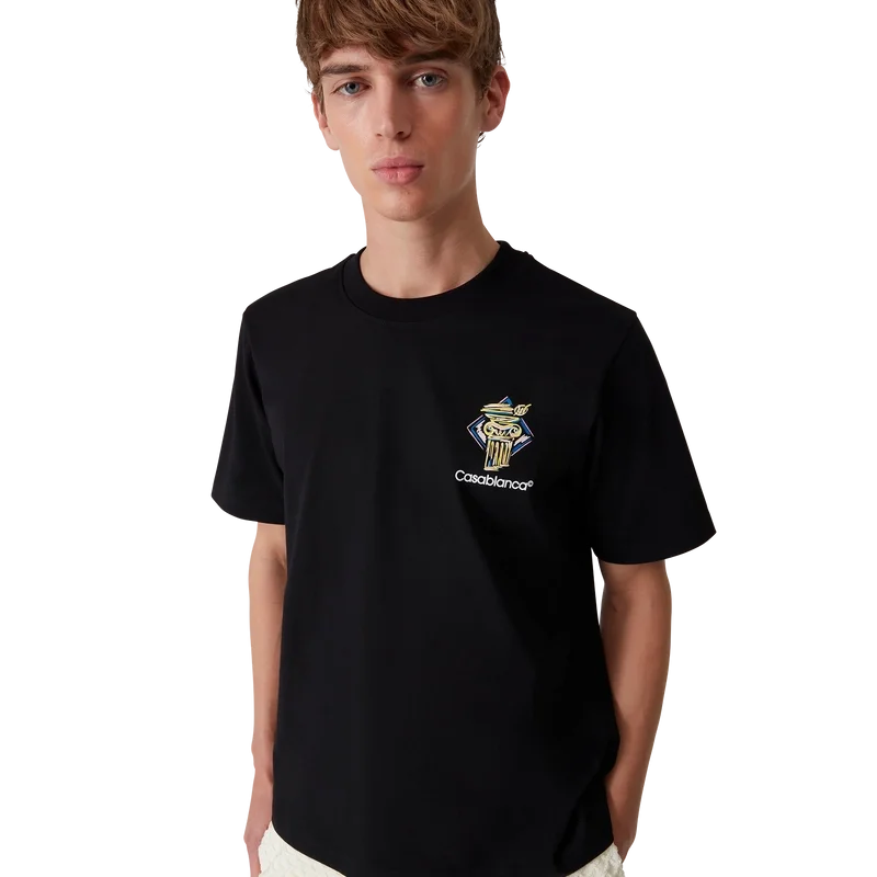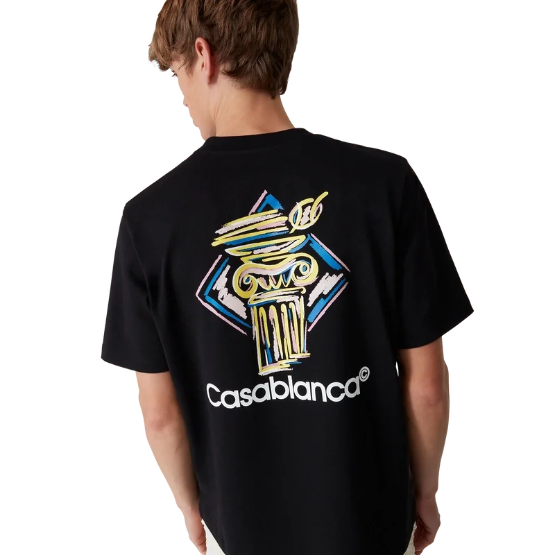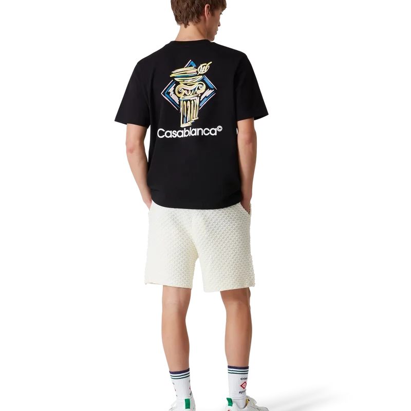 Tricoul Diamond Column este un model cu mâneci scurte, imprimat, confecționat din bumbac organic, cu iconografia casei sub forma unei coloane desenate cu creionul. Are guler rotund clasic și logo Casablanca.