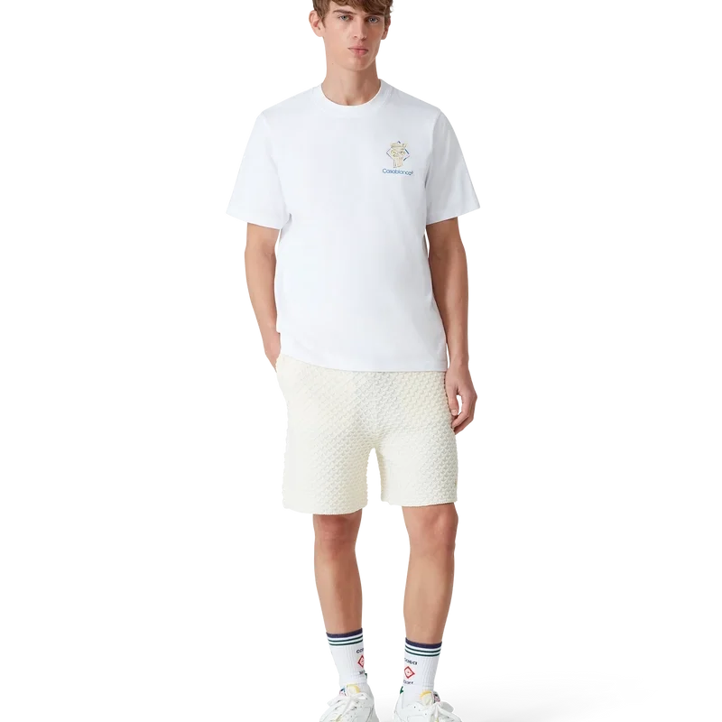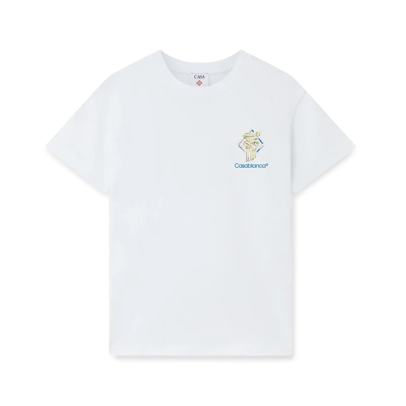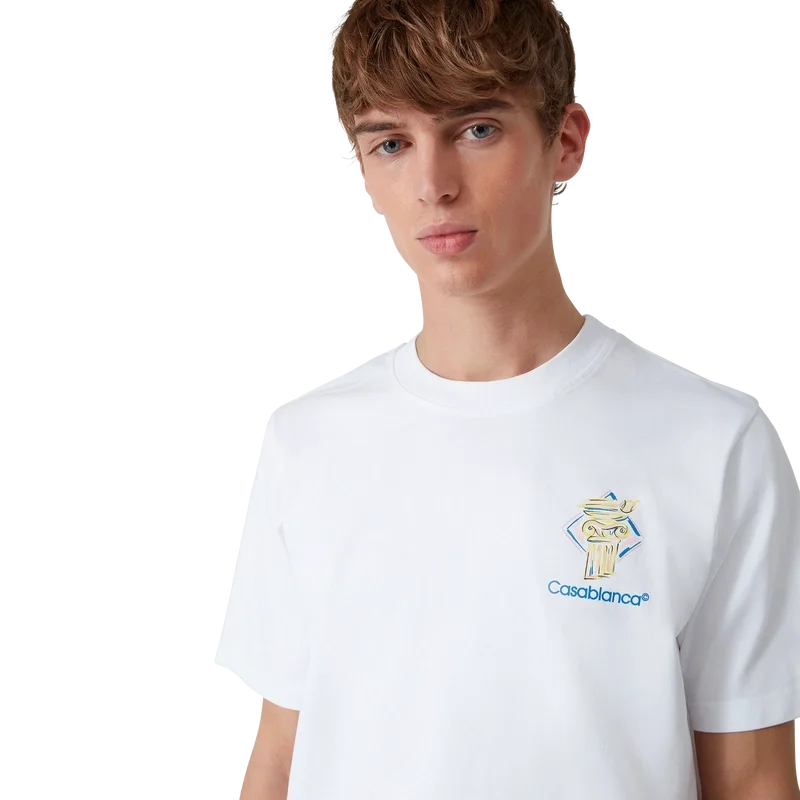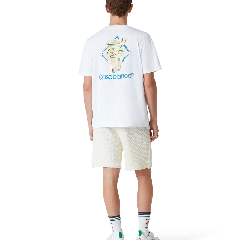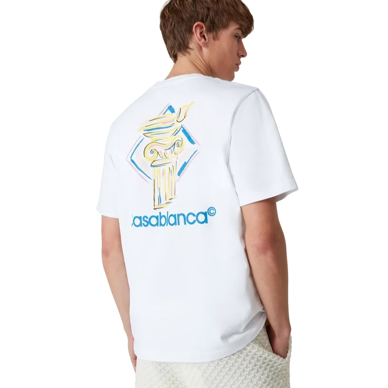 Tricoul Diamond Column este un model cu mâneci scurte, imprimat, confecționat din țesătură de bumbac organic, prezentând iconografia Casei sub forma unei coloane desenate cu creionul. Completat cu un guler rotund clasic și logo-ul Casablanca.