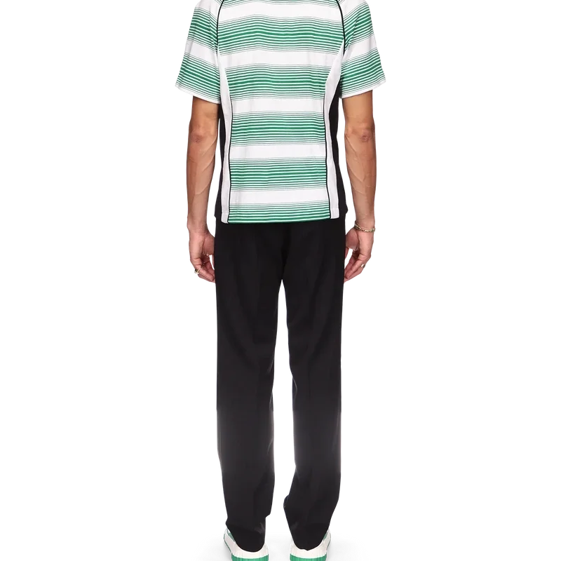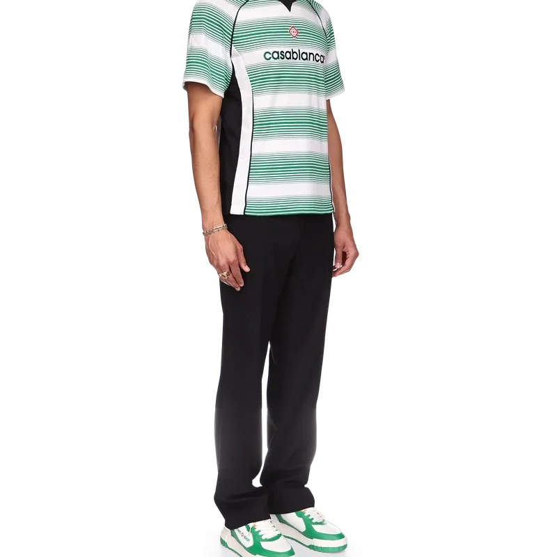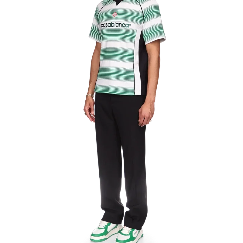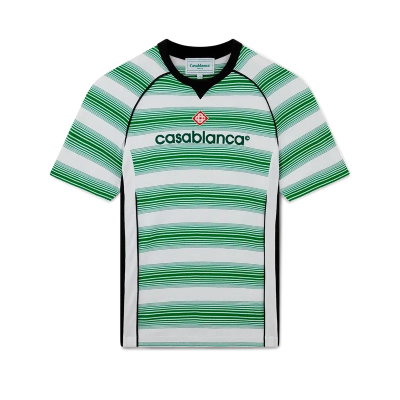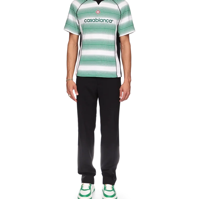 Tricou de fotbal cu panouri cu dungi degradate este un model sport cu mâneci scurte, inspirat de culorile steagului nigerian. Confecționat dintr-un material din bumbac organic și completat cu logo-ul diamant caracteristic al casei, un logo Casablanca pe piept și un guler clasic rotund.