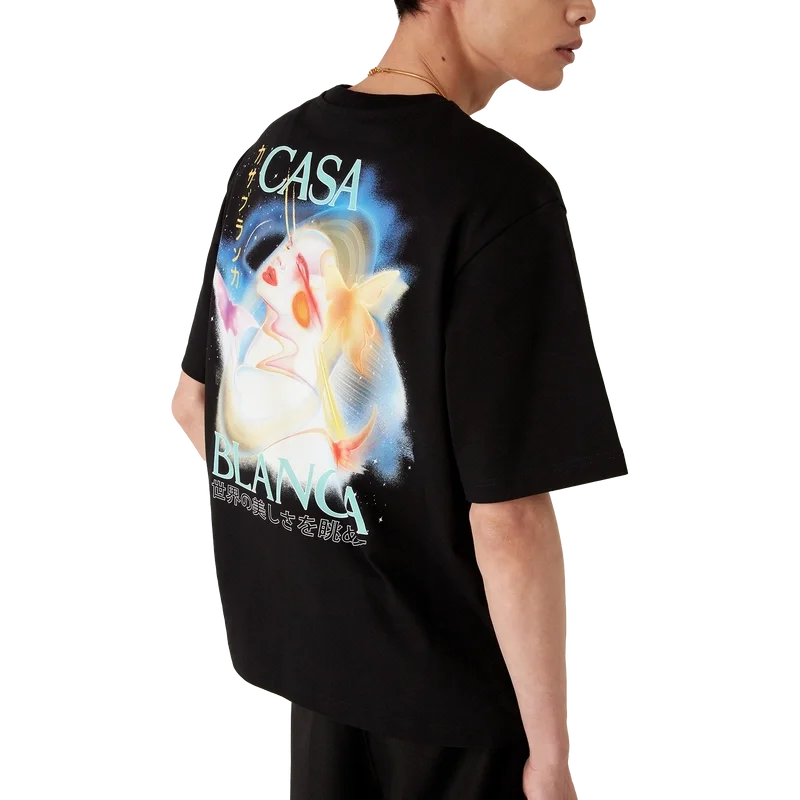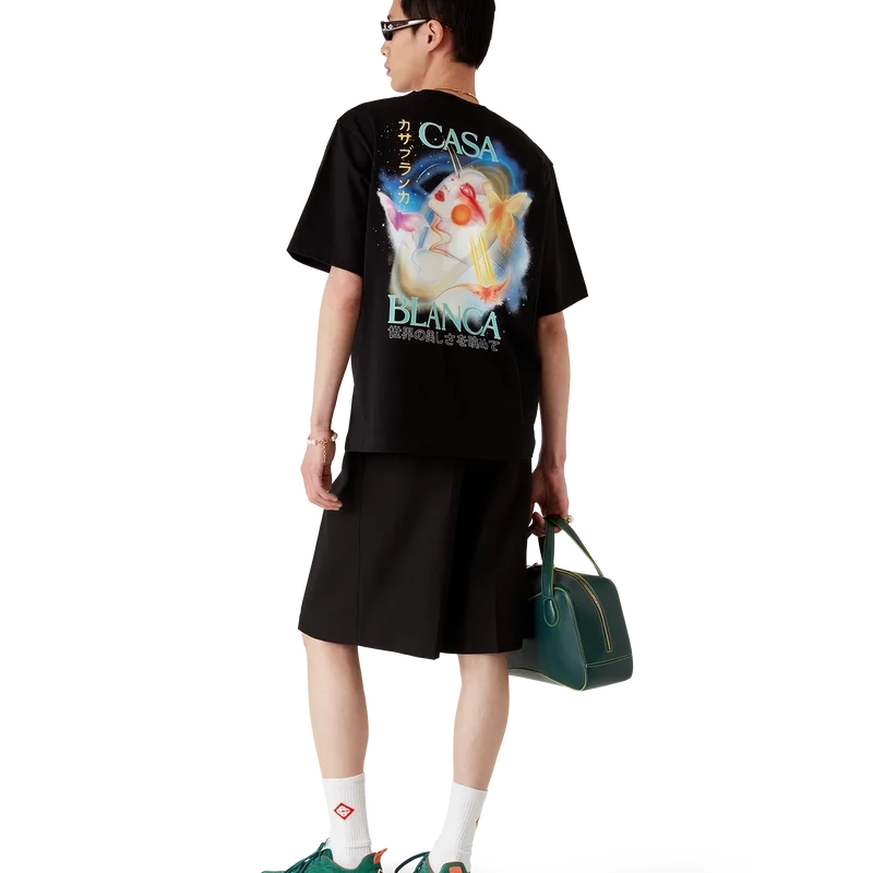 Tricoul Galactic Connection este un model cu mâneci scurte, imprimat, confecționat din bumbac organic, prezentând grafica sezonieră realizată cu aerograful a casei de modă – inspirată de Pater Sato; cu Galactic Connection explorăm cine ar fi ființele bionice din Casablanca, păstrând în același timp elementele montane în fundal. Completat cu un guler clasic rotund.