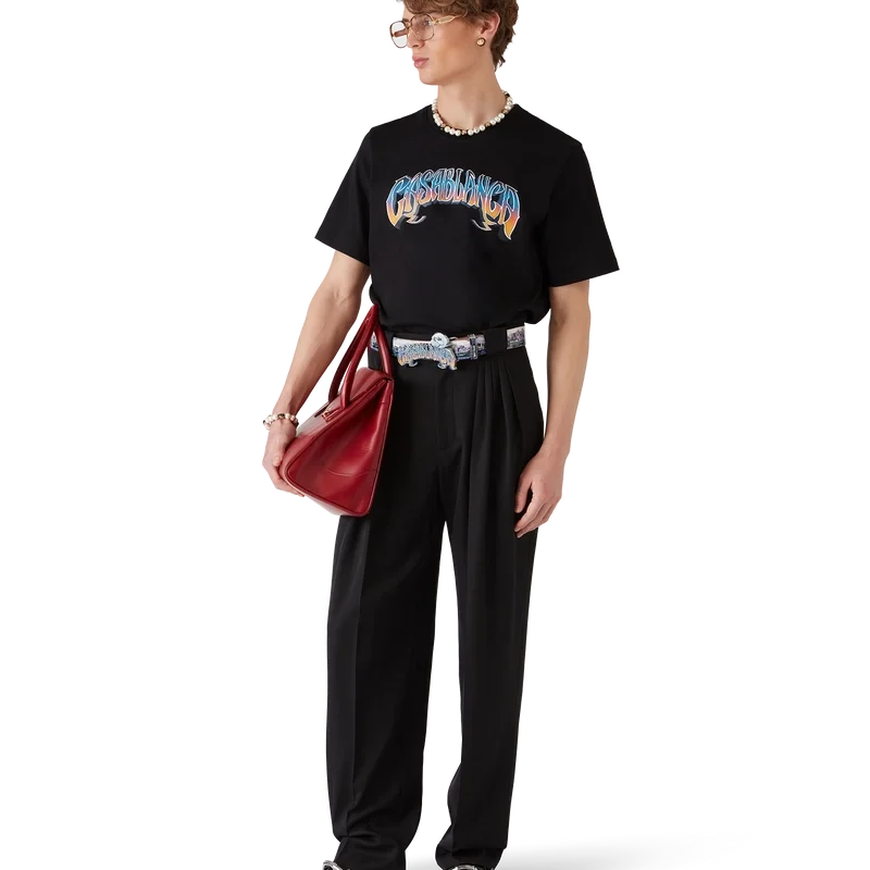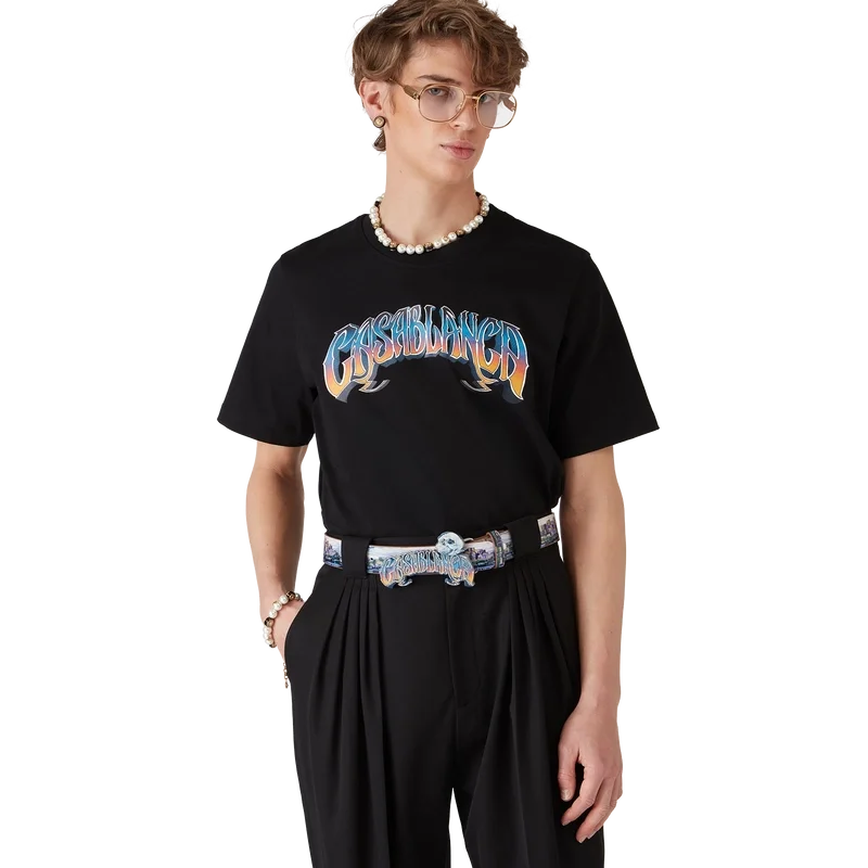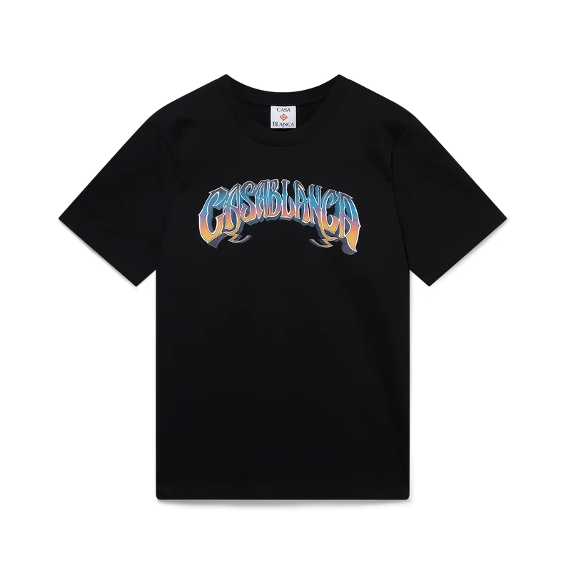 Tricoul Gradient Gothic este un model cu mâneci scurte, imprimat, confecționat din bumbac organic, cu tipografie desenată manual a logo-ului Casablanca, cu gradientul sezonului, inspirat de fontul gotic folosit în tatuaje. Completat cu un guler clasic rotund.