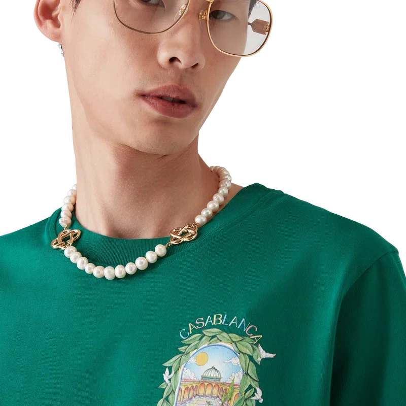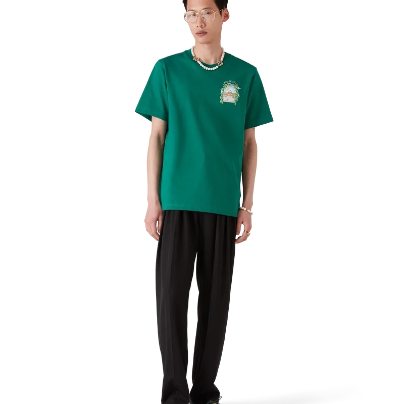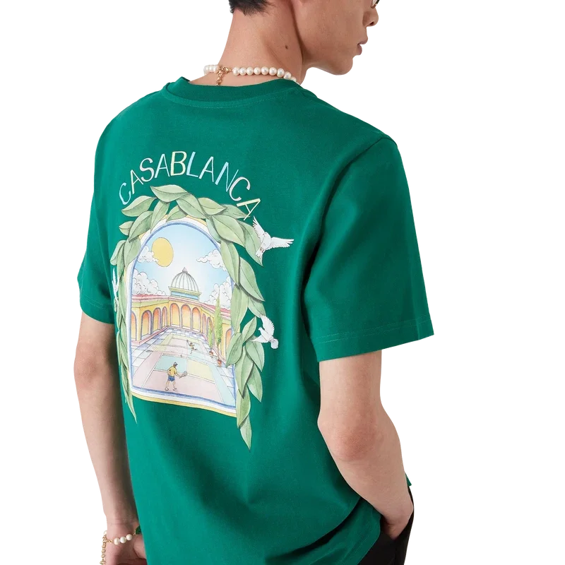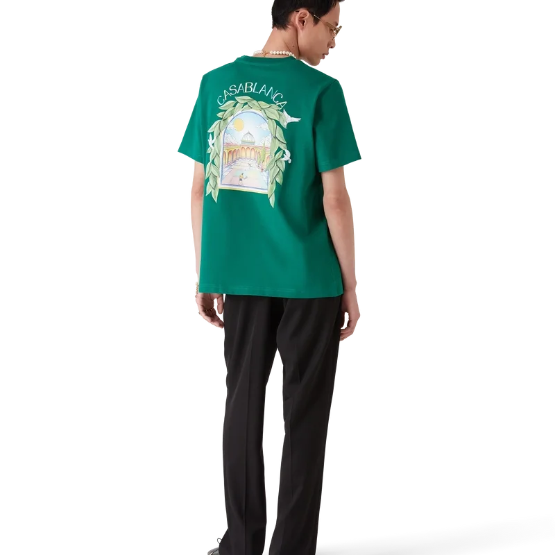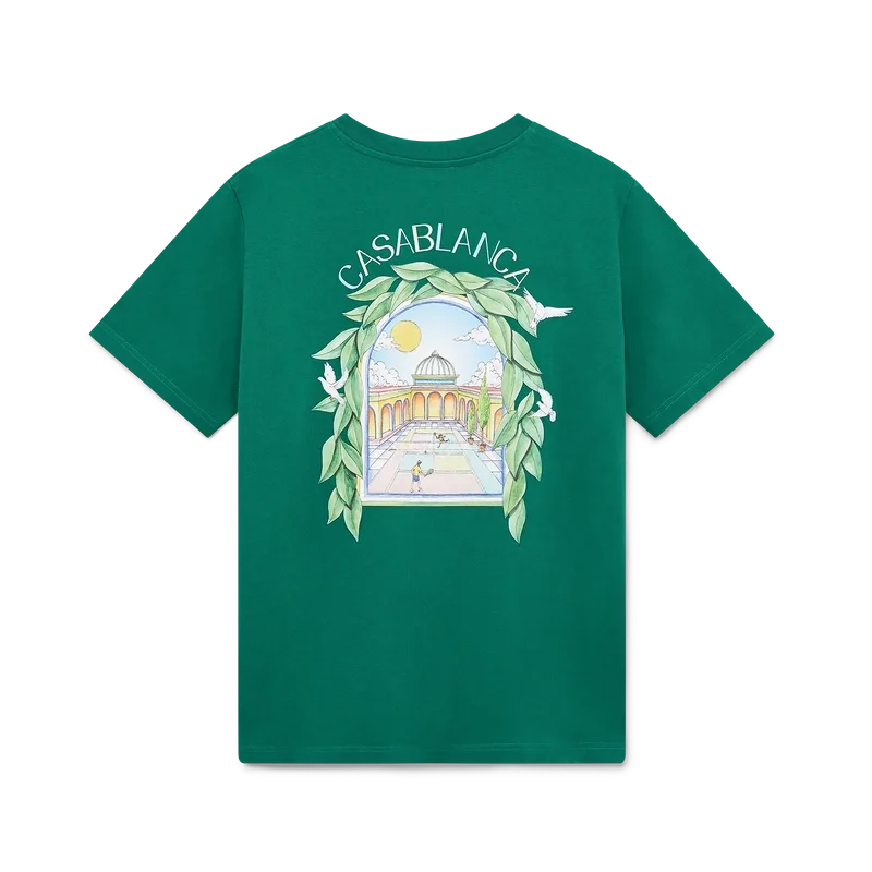 Tricouri L’arch De Tennis cu pantaloni scurți și imprimeu sezonier serigrafiat în care fluxul liber al naturii se întâlnește cu structura designului creat de om – arcul, un simbol abstract al forței. Completat cu un guler rotund clasic.