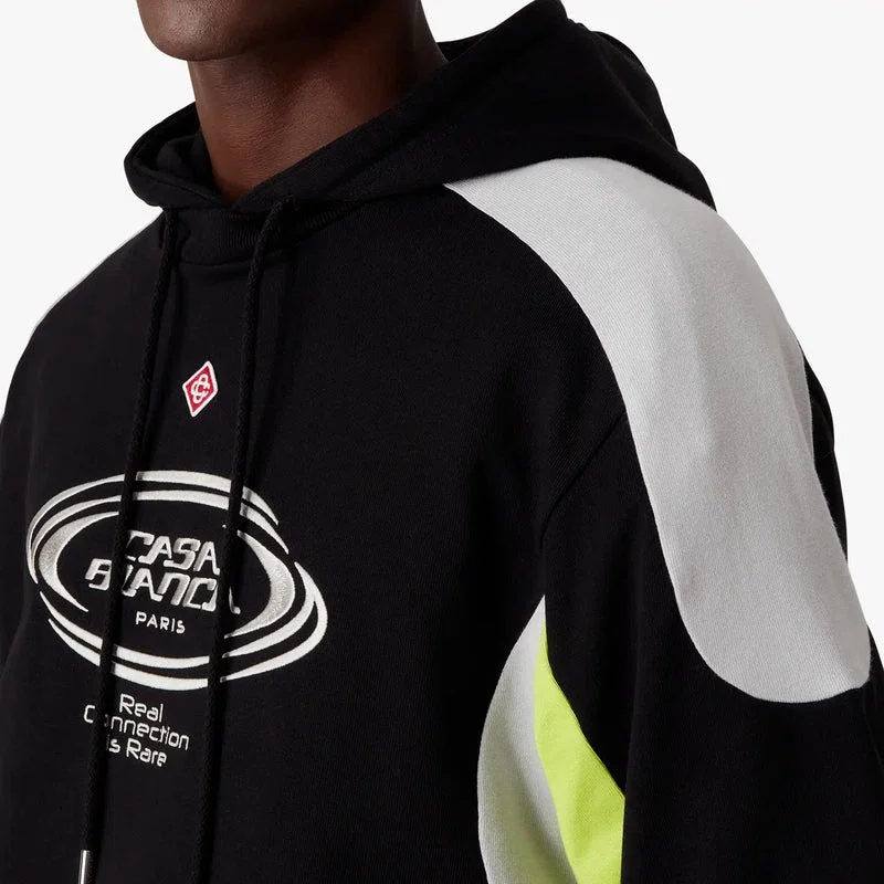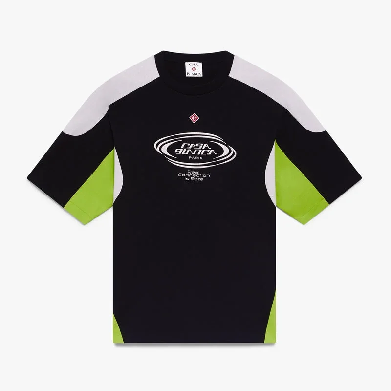 Tricou oversized cu pantaloni scurți și blocuri de culoare negru și gri are un design rafinat, cu un model în blocuri de culoare și logo-ul diamant caracteristic al casei. Este completat de un guler rotund clasic, logo-ul Casablanca al casei și o siluetă oversized.