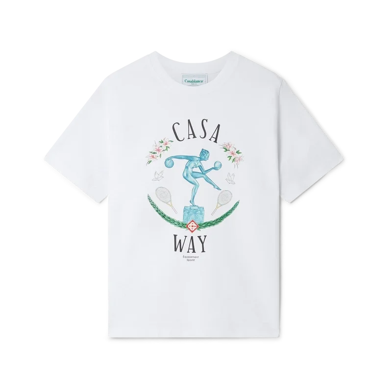 Tricou Statue En Marbre este un model cu mâneci scurte, confecționat din bumbac organic, cu un design sezonier inspirat de Art Deco, care omagiază sculptura unei doamne ținând două mingi de tenis, rachete de tenis și o coroană de lauri. Completat cu guler rotund clasic și logo-ul Casa Way.