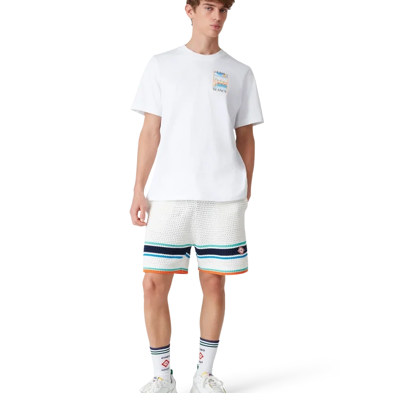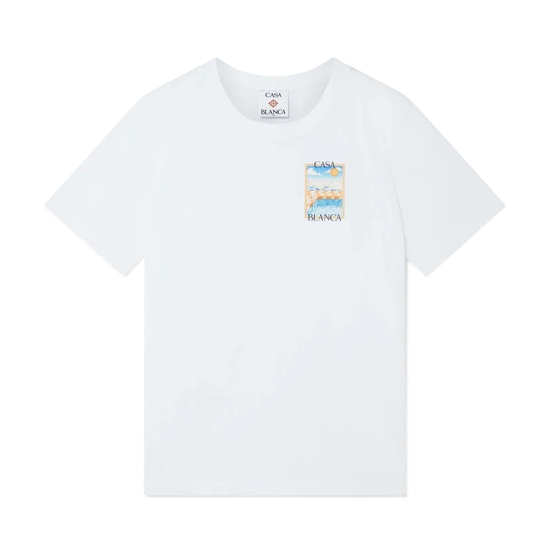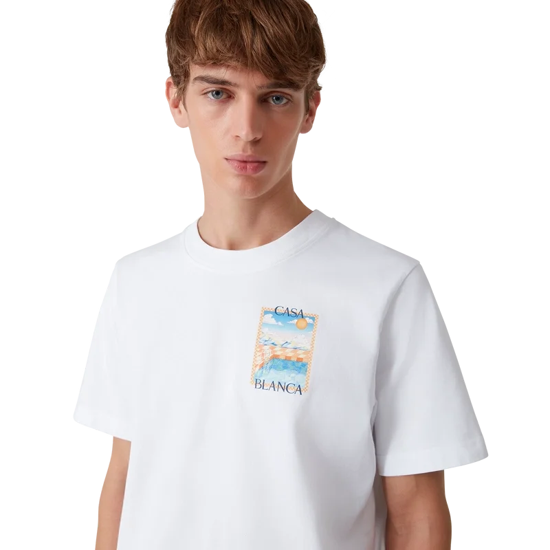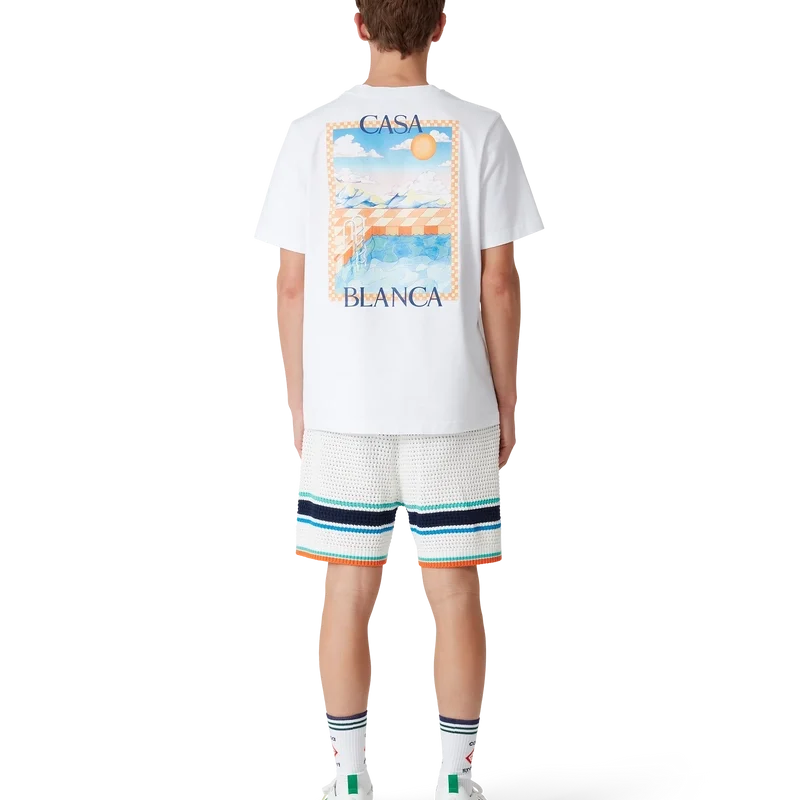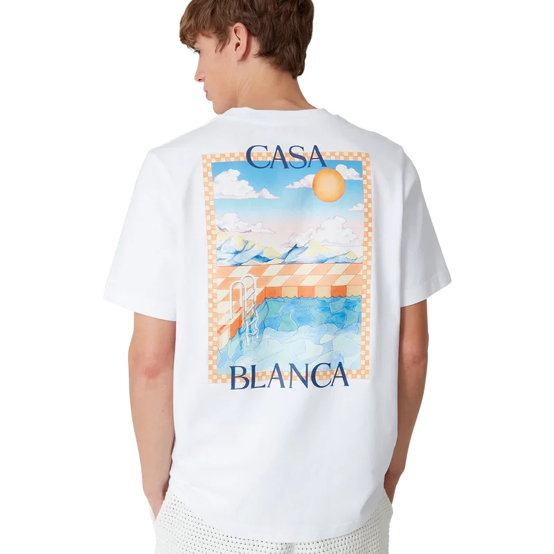 Tricoul Surreal Pool este un model cu mâneci scurte, imprimat, confecționat din țesătură de bumbac organic și prezintă scene pictate manual, create special pentru această colecție. Are guler rotund clasic.